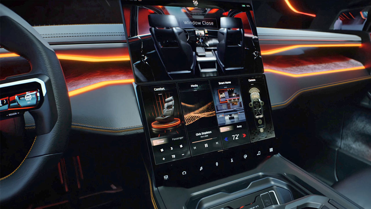 On the inside, notice that the “tuning fork” design is replicated on the dashboard in the form of ambient lighting. And, if you look carefully, the central touchscreen is actually comprised of two screens, offering a combined real estate of 28-inches. The lower display has three different positions depending on the task at hand—minimal view, extended view and full-screen view—and can also be removed and used if needed. The upper screen can also slide on the rail attachment system. The rearview mirror is packed with tech including a smart backup camera with 360-degree views; speakers and receivers compatible with voice assistants such as Alexa and Siri, and a supplementary backup flood lamp.