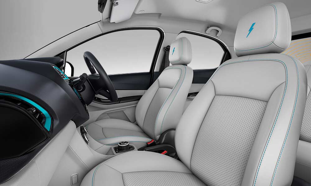 As you can probably tell from the photos, the Tiago EV Blitz features visual enhancements in the form of fully blacked-out front grilles; black wheel arch extensions; black 15-inch light-weight alloy wheels wrapped with lower profile tyres, and a black roof spoiler. These additional black elements look particularly contrasty against the Frost White body color. On the inside, the headrests feature the blitz logo. Also, the drivers get to monitor the multi-level regeneration on the instrument cluster in real-time.
