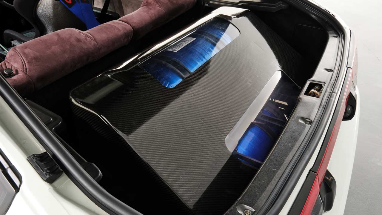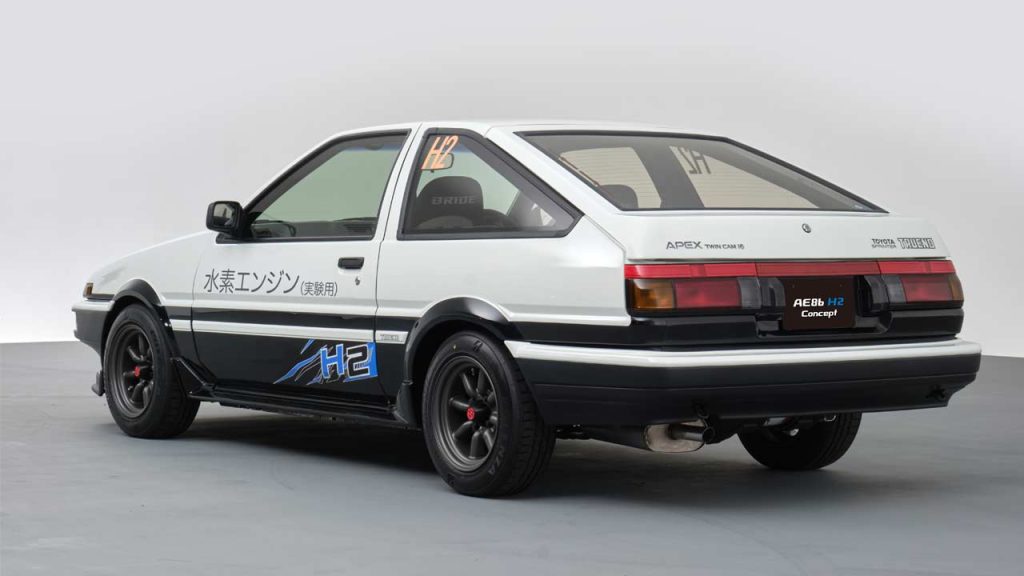 Toyota didn’t bother sharing a lot of details on these restomods for some strange reason, but simply said that the AE86 H2 concept was restomodded in assocation with the Gazoo Racing (TGR) division. It is based on the Sprinter Trueno 2-door coupe of the AE86 series. Just to clear any confusion, this is NOT a hydrogen fuel cell electric vehicle (FCEV), but a hydrogen-engine vehicle. Meaning, the combustion engine drinks hydrogen insead of petrol. For this, TGR borrowed two hydrogen storage tanks from the Mirai FCEV and placed them at the back of the car.