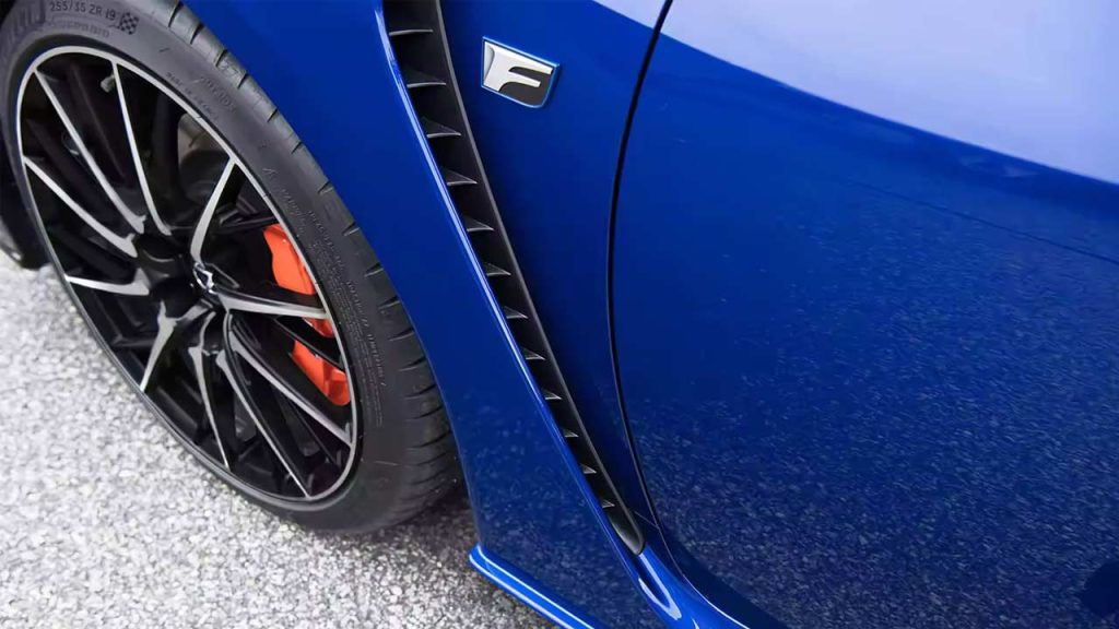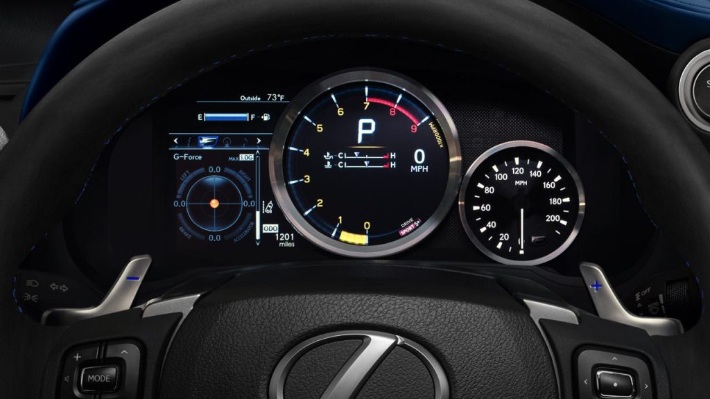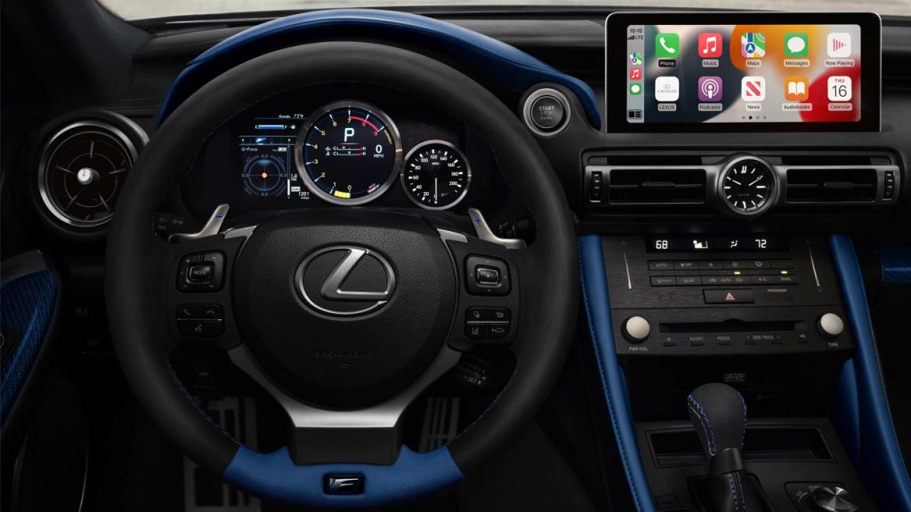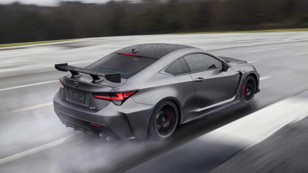There’s also the $17,775 RC F Carbon Package that gets you carbon fibre exterior parts (includes roof and a retractable wing rear spoiler among other bits); 19-inch matte black wheels wrapped with Michelin Pilot Sport 4 S tires; carbon fibre interior bits; leather-trimmed heated and ventilated front seats; heated steering wheel with power tilt/telescopic steering column, and Intuitive Parking Assist.