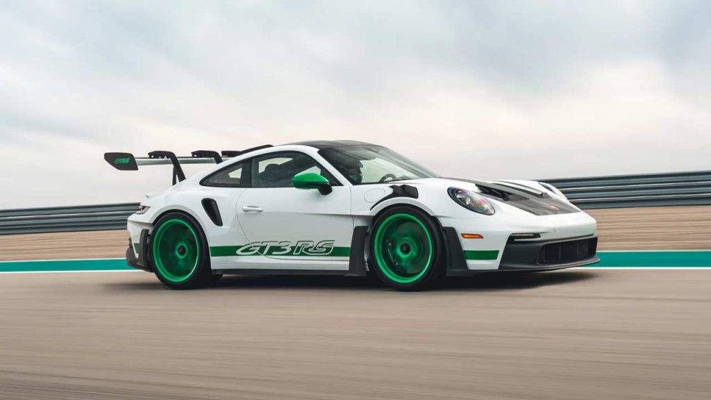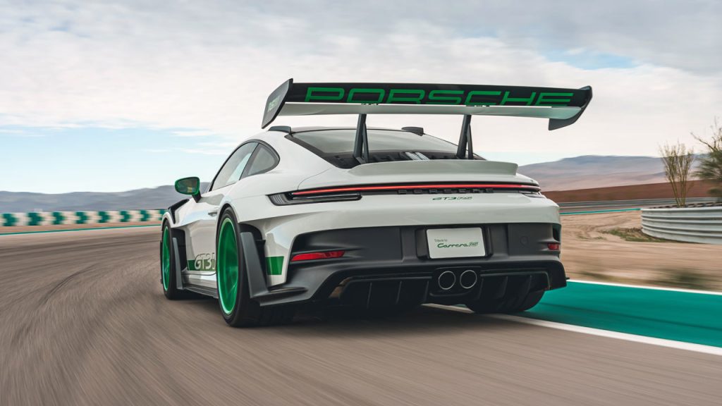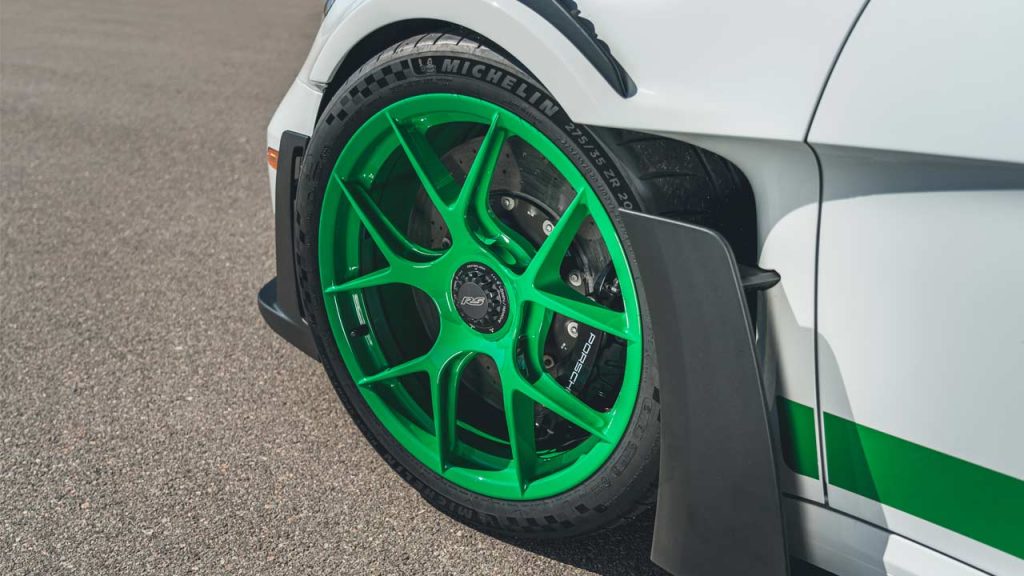 So, what do you get for all those extra dollars that could buy you a 718 Cayman S or a 718 Boxster S and still have plenty of money left for a party? Well, for starters, the package pays homage to 1972/1973 911 Carrera RS 2.7. How about that for a pickup line? But as you know, the pickup lines don’t really work these days, and so, the tribute elements include Python Green elements such as the Magnesium wheels, mirror caps, side decals, and branding on the rear wing. The wing end plates feature an RS logo and an American flag icon next to it. As you can also probably see, the GT3 RS badging at the rear is also in Python Green.