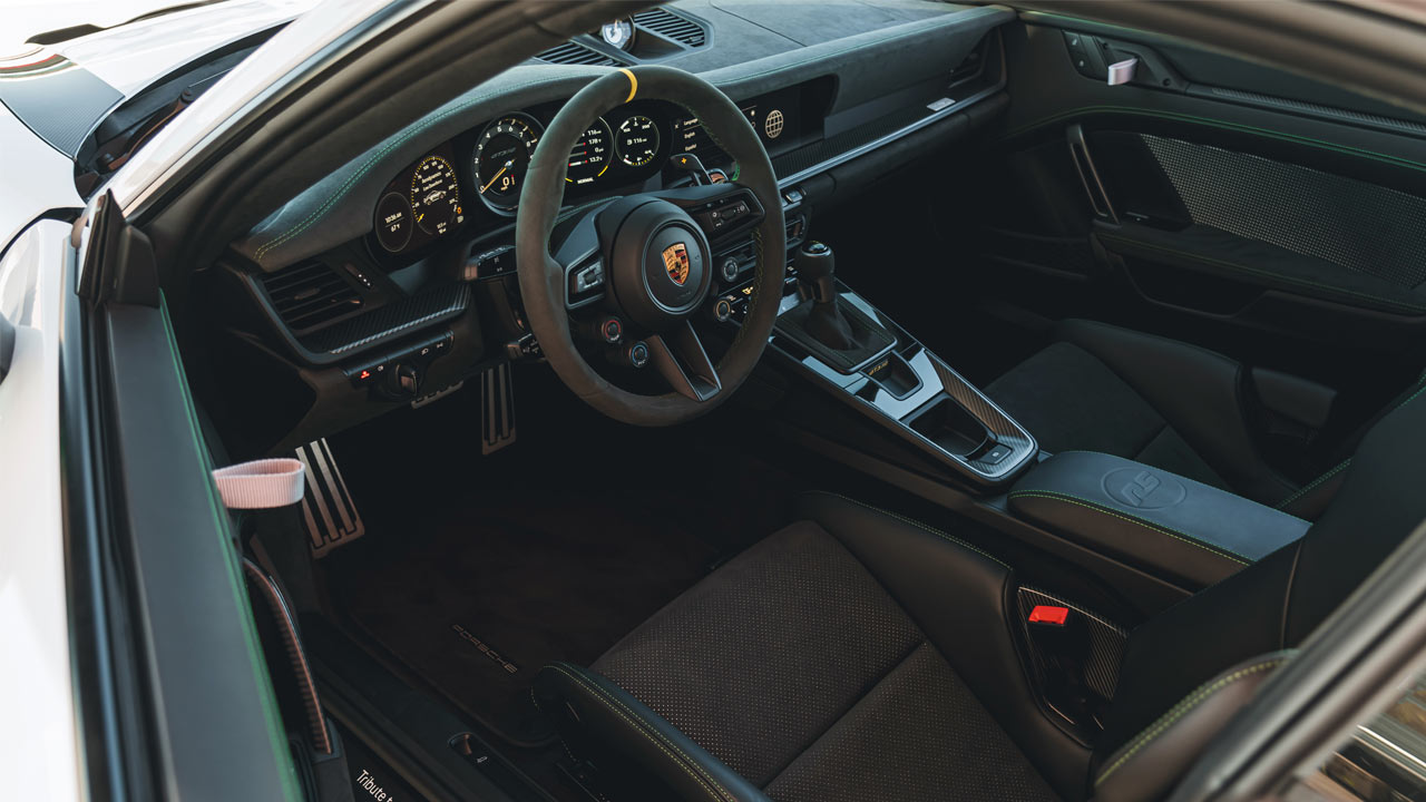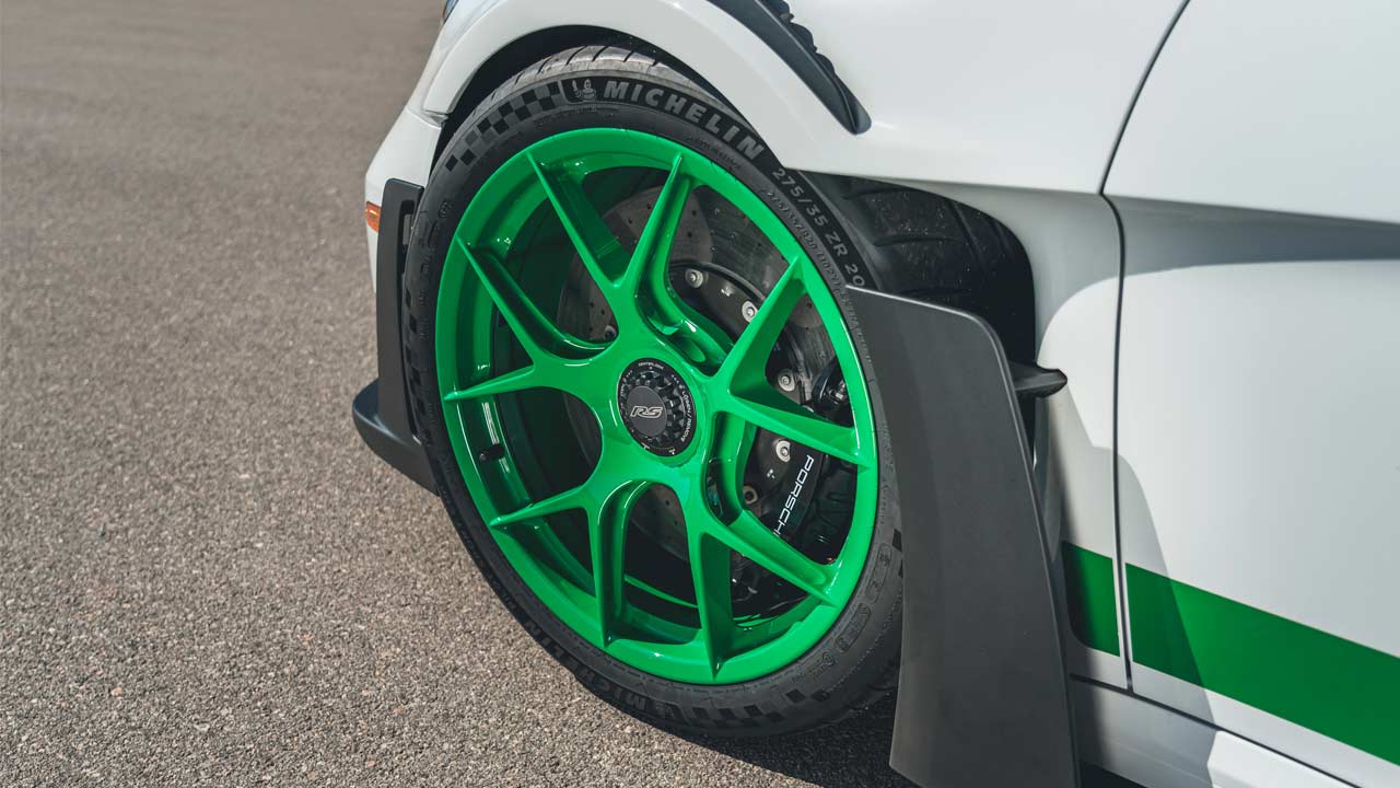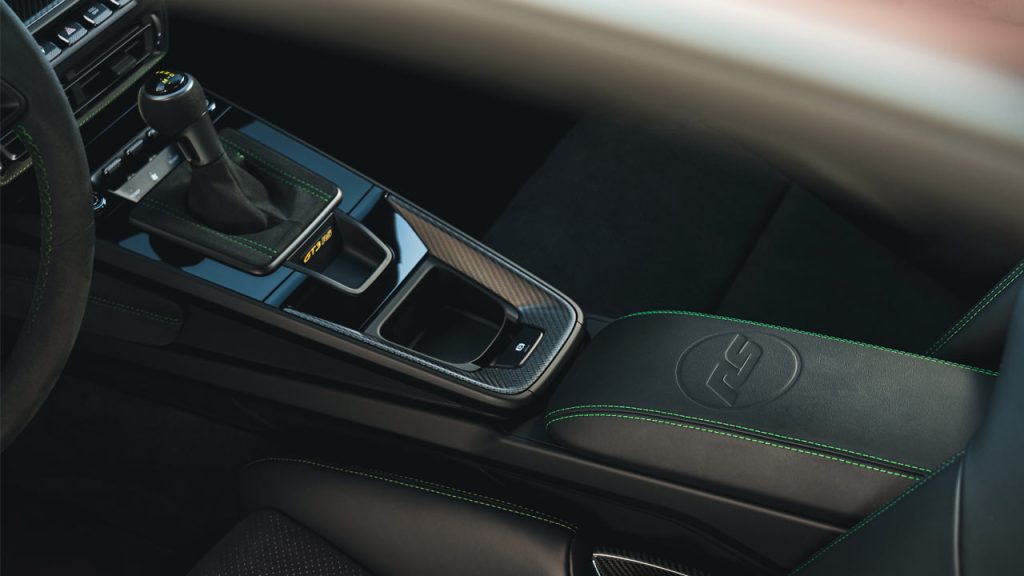 On the inside, you get special illuminated door sills, an RS-branded central armrest, and Python Green contrast stitching. The $33,520 Weissach Package is included as standard here, which gets you—among many other things—a carbon fibre hood, a carbon fibre roof, Magnesium shift paddles, CFRP anti-roll bars front & rear, and CFRP coupling rods and underbody panel on the rear axle. The aforementioned forged Magnesium wheels are also part of the Weissach Package. Those who don’t fancy the exposed carbon roof and hood can ask Porsche to get them painted in body color at no extra cost.