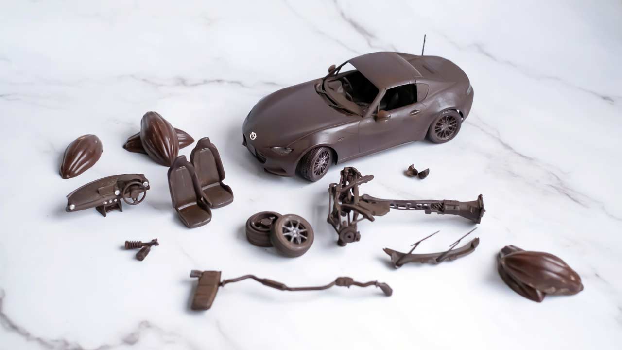 As a St. Valentine’s Day special, Mazda collaborated with Tokyo-based pastry chef Kenta Hasegawa to create an impressively detailed Miata RF (Retractable Fastback) made of chocolate. It’s not just the exterior body we’re talking about here. As you can probably see, the chocolate box contains parts including the driveshaft, gearbox, suspension components, exhaust system, wheels, dashboard, and of course, seats. Understandably, the roof mechanism doesn’t work, but notice the logos made of white chocolate.
