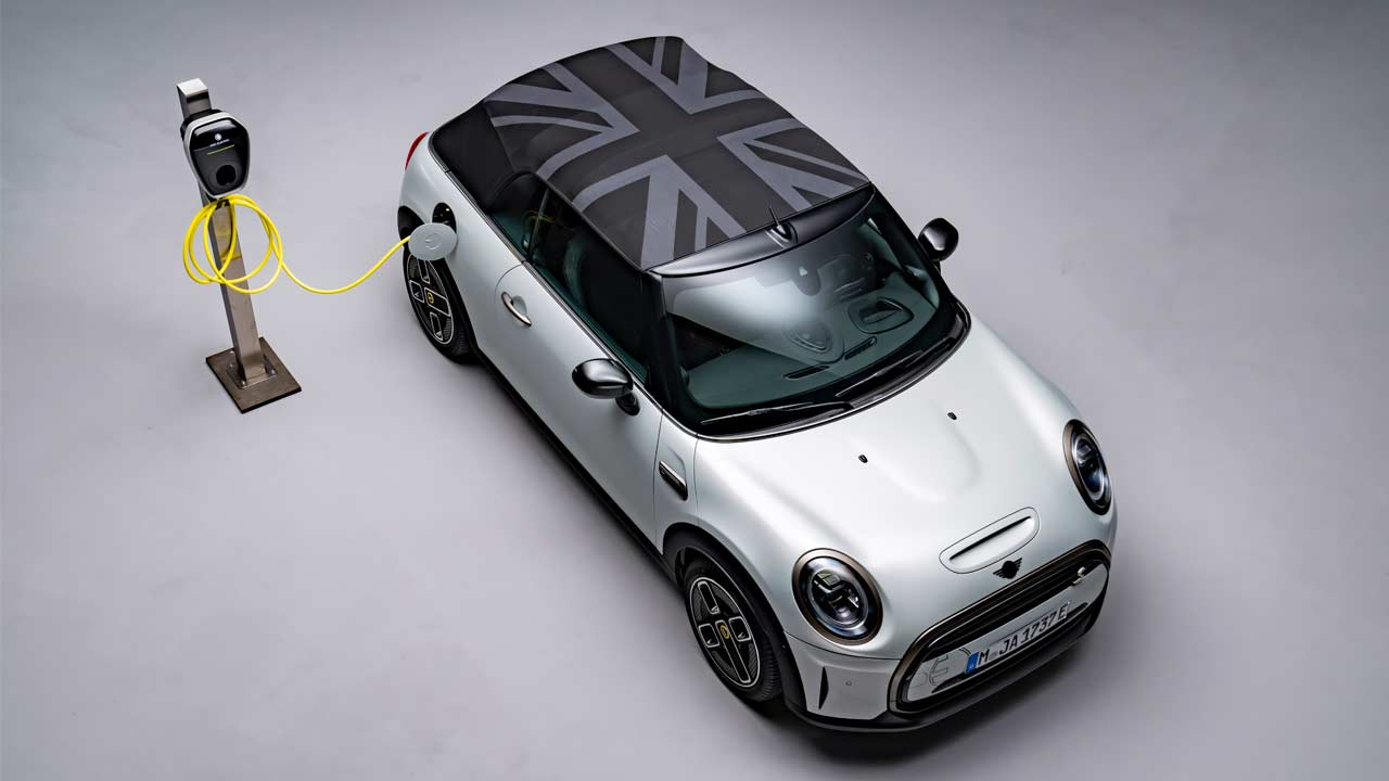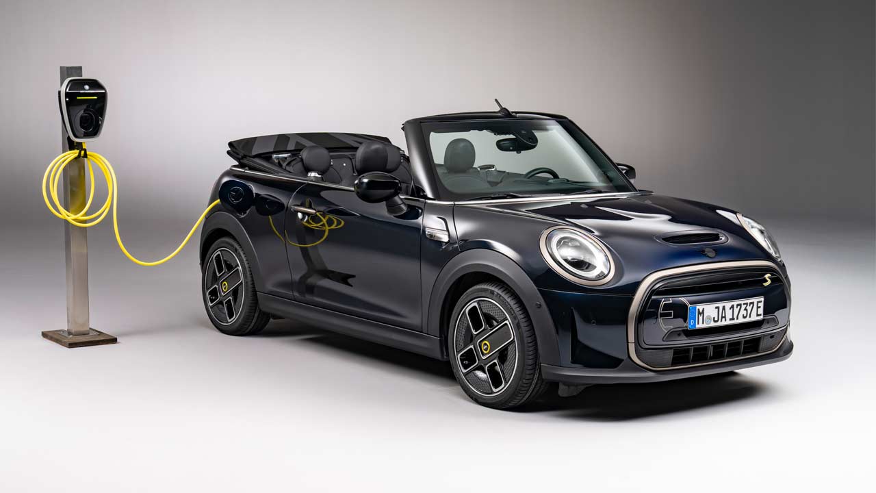 But in the meantime, let’s take a look at all the hoopla. Well, the MINI Cooper SE Convertible is available in Enigmatic Black and White Silver paint options. But no matter what paint you choose, the fabric roof is gonna be in this dark gray color featuring a contrasting Union Jack. The electric roof can be operated while the vehicle is in motion at speeds of up to 30 km/h (19 mph). The rest of the things are pretty much the same as those of the fixed roof version as you can probably tell; I mean, the wheel design and the contrast touches. And, since this is a limited edition, there’s sort of a special plaque on the front fender.