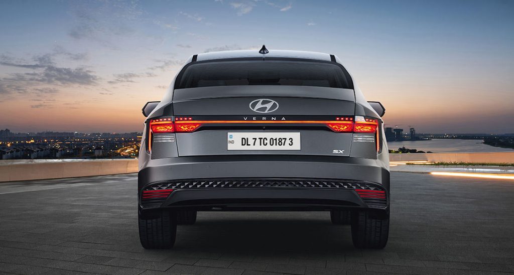 The 6th-gen Verna sports a new design language with a full-width light bar at the top of the front fascia, followed by LED headlights at the outer edges of the grille. The side profile has sharp creases similar to those of the Elantra, while at the rear, again, there’s a full-width light bar. SX variants are fitted with 16-inch alloy wheels, with turbo models boasting black wheels. The SX variants also get a smart electric sunroof.