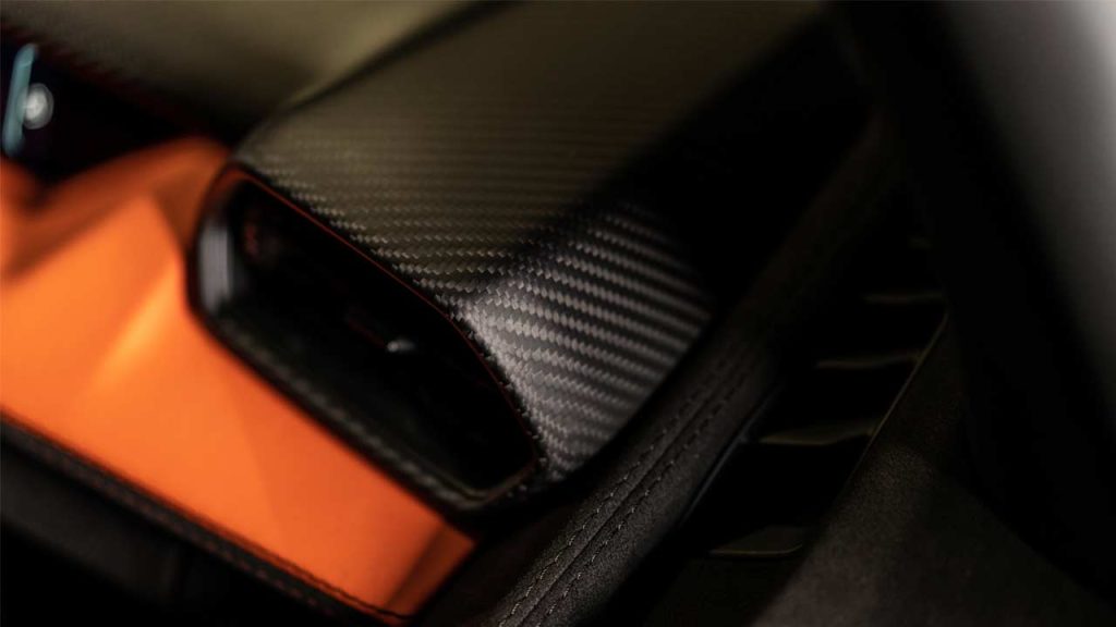 As for active aero, you got an active rear wing with its position changing depending on the driving mode you’re in, or the computer’s decision on what’s best for that specific situation. However, there’s a dedicated rotary knob on the steering wheel to manually adjust the wing position. And, the specially designed carbon fibre front splitter’s central area channels the airflow to four rear vortex generators—consisting of narrow curved blades positioned in the underbody that play a key role in increasing the energy of the airflow. This, in turn, generates additional downforce and directs the airflow toward the diffuser. Thanks to the diffuser’s design and shape, it also performs a dual-role of helping the engine bay stay relatively cool.