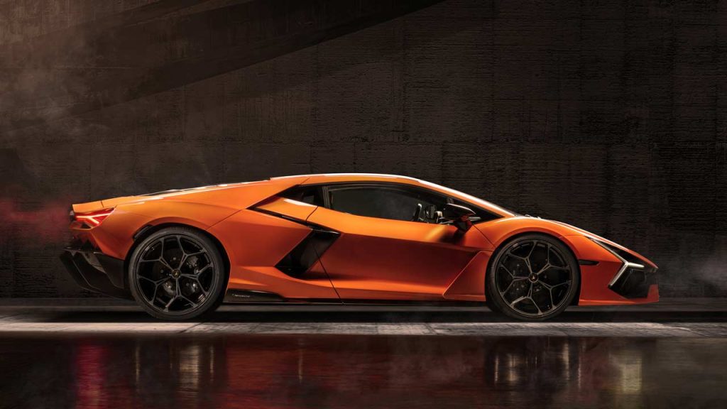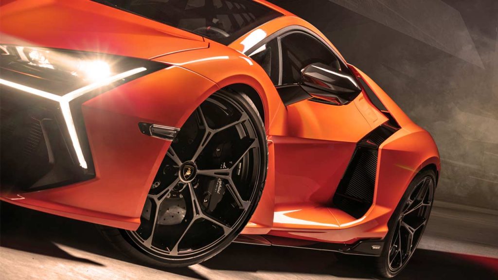 The Revuelto measures 4,947 mm long, 2,266 mm wide (including mirrors) and 1,160 mm tall, with a wheelbase of 2,779 mm. While the width remains mostly unchanged, the Revuelto is significantly longer (+167 mm) than its predecessor. A 24 mm extra height should offer a bit more headroom for taller occupants. The electrified bull rides on a staggered wheels setup of 20-inch at the front and 21-inch at the rear, while buyers can opt for a 21-inch front and 22-inch rear setup. Lamborghini has partnered with Bridgestone to develop bespoke Potenza Sport run-flat tyres for the car (two run-flat variants and one tubeless variant). Brake discs (Carbon Ceramic Brakes Plus) measure 410 x 38 mm at the front gripped by 10-piston calipers and 390 x 32 mm at the rear gripped by 4-piston calipers.