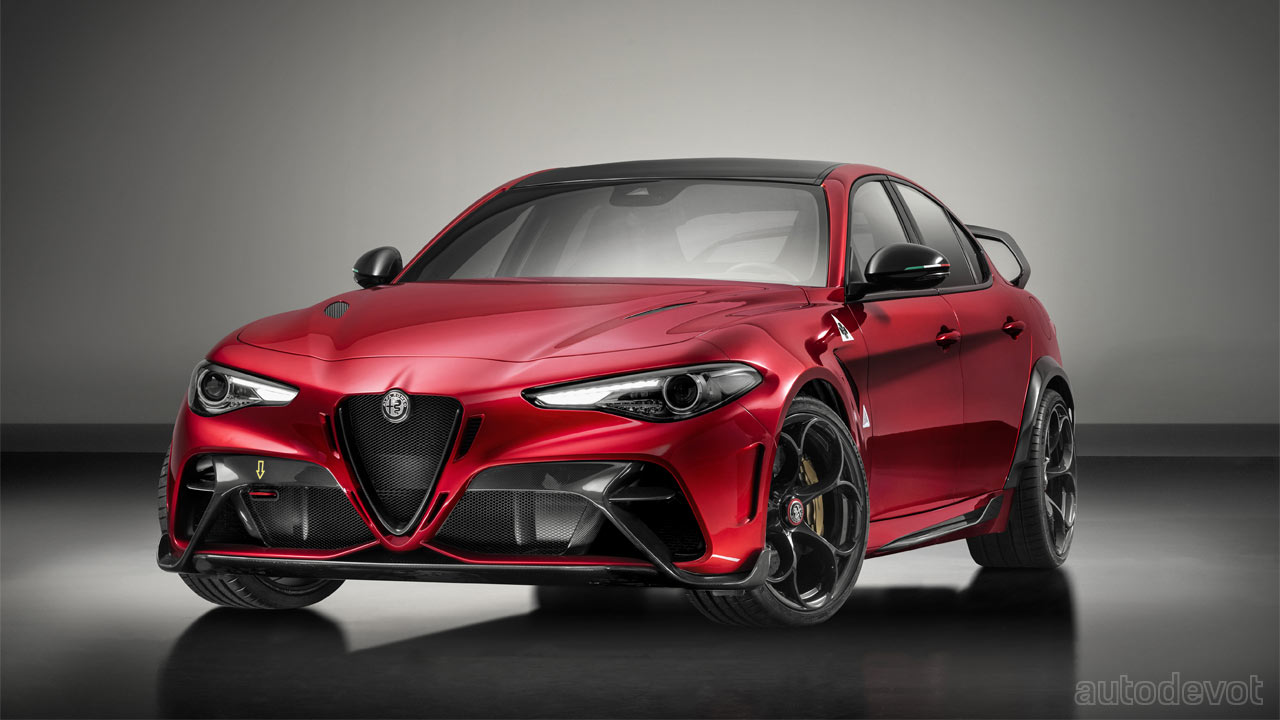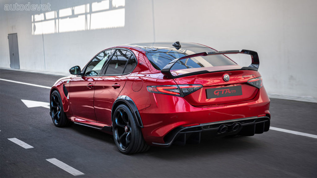 In 2020, Alfa Romeo revealed the Giulia GTA and Giulia GTAm as part of the brand’s 100th-anniversary celebrations. The models were limited to 500 units worldwide. The 2.9L V6 biturbo engine offered 397 kW or 540 metric hp here, which is 30 metric hp more than the Giulia Quadrifoglio. The GTAm—in particular—boasted a weight reduction of about 100 kg (220 lbs) compared with the Quadrifoglio.