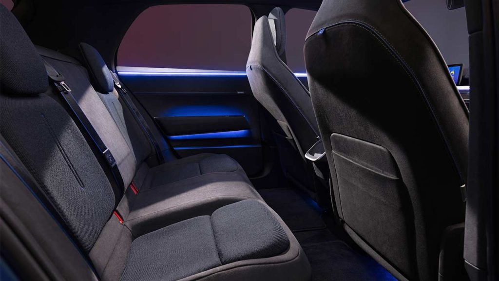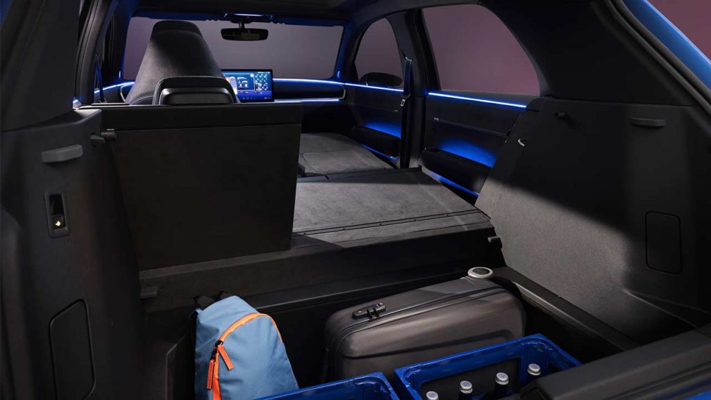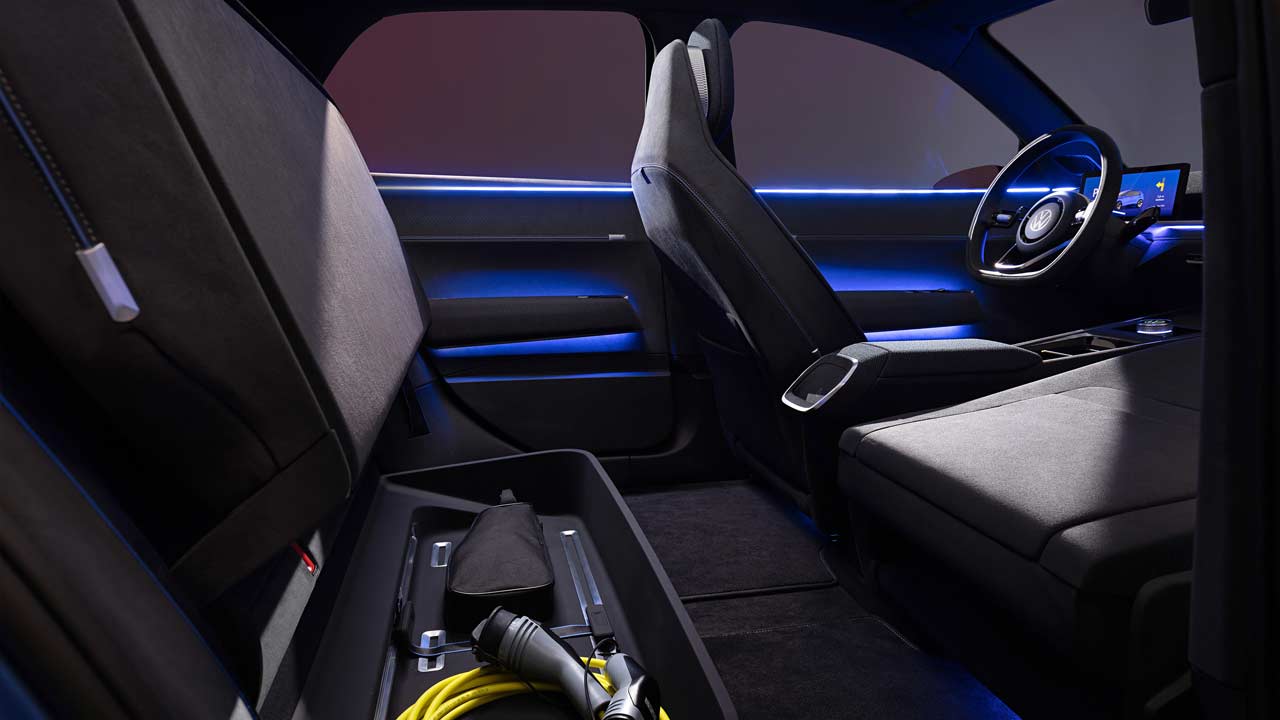 The minimalistic dashboard houses a display for the driver (10.9-inch) and another display (12.9-inch) in the middle; both look as though they’ve been casually placed over there. You can also notice the ID.-typical play-pause pedals. And of course, a 3-spoke flat-bottom steering adds the necessary sporty touch. There’ll also be USB-C ports in addition to a 230-volt socket.