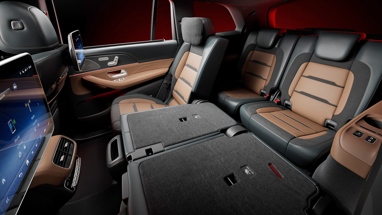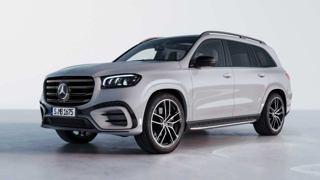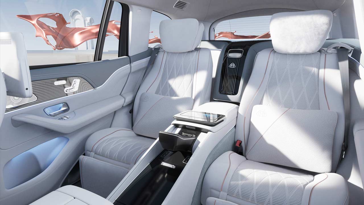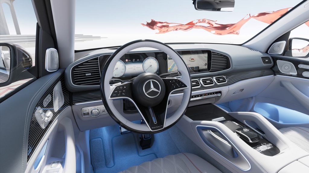 Inside, there’s an updated version of the MBUX software, of course. It offers three themes for the displays: Classic, Sporty, Discreet, and three modes: Navigation, Assistance, Service. As for materials, two new leather colors have been added. The range of interior trim finishes has also been revised. Glossy brown lime wood is now standard. The glossy black flowing lines piano lacquer—which was previously reserved for the Maybach GLS—is now available for the entire GLS lineup. The Maybach GLS now gets ambient lighting with animated projection of the Mercedes‑Maybach pattern as standard. This model also now features diamond-pattern quilting with perforations on the seat centre sections and backrests.