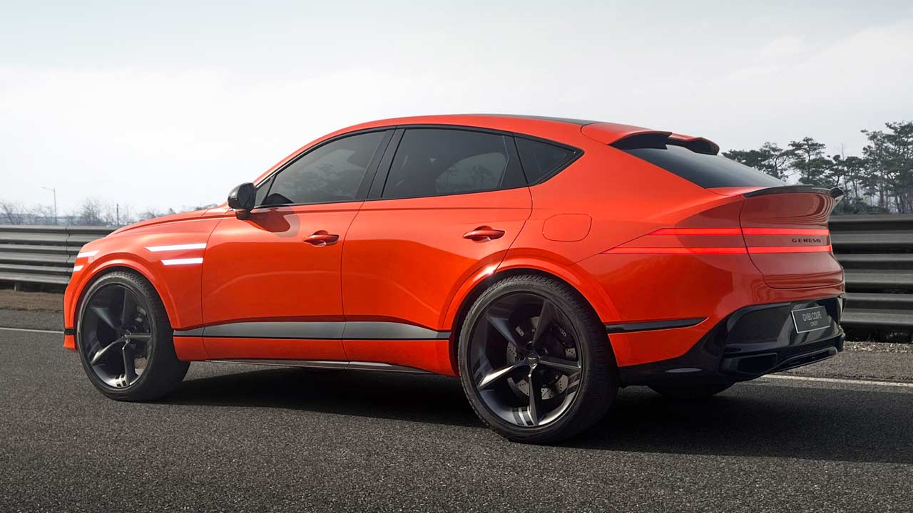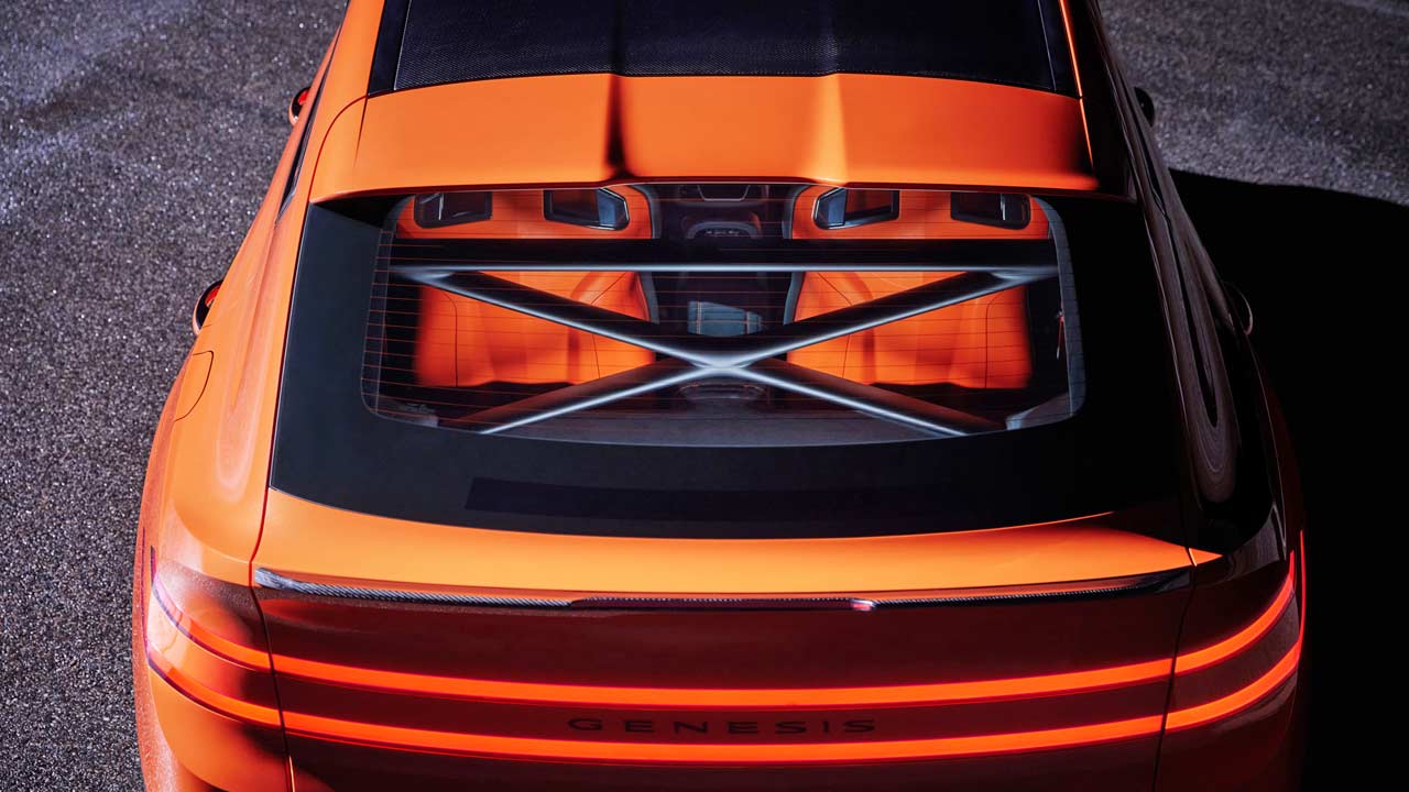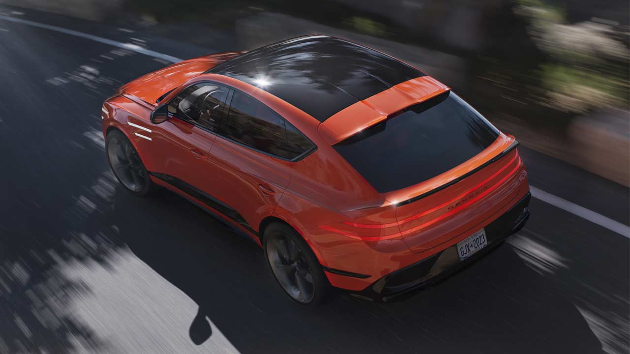 Group’s Chief Creative Officer Luc Donckerwolke might read all your comments, so be nice! But anyway, the front fascia looks a lot sporty here with a sporty bumper design and gloss black inserts. The Crest Grille has that brand-specific G-Matrix pattern, but it’s all black here, matching the rest of the dark elements on the car. On the side, you can see one more brand-specific design element, the parabolic line, but obviously, the GV80 Coupe is all about that coupe roofline. The roof sports those double spoilers, while there’s another ducktail spoiler on the rump. BTW, the roof is made of carbon fibre.