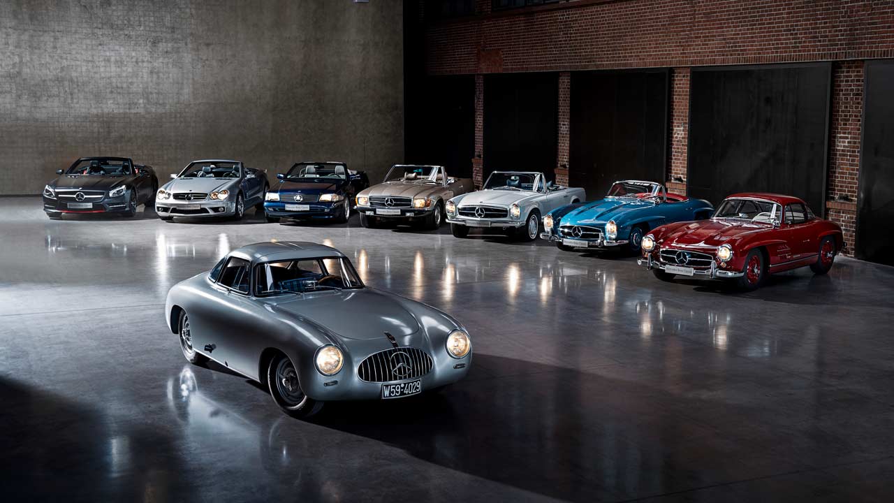A proud father: Six generations of Mercedes-Benz SL, and all came into existence thanks to Max Hoffman who saw road cars in the 300 SL racing car (W194) that stands proudly at the front of this frame.