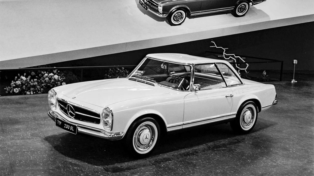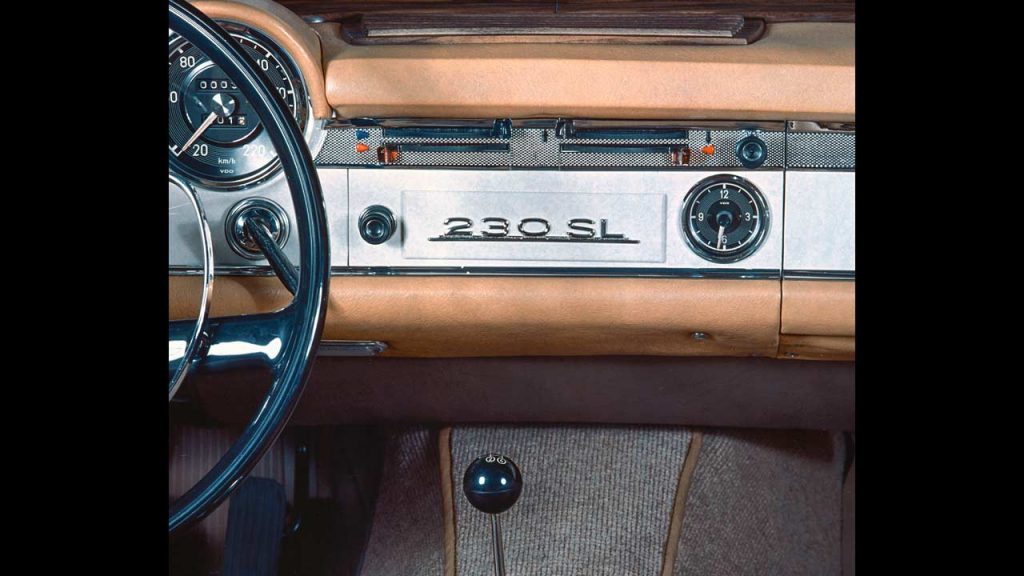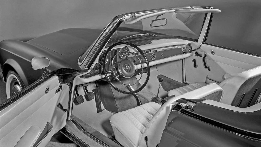 The Pagoda nickname was due to the model’s distinctive concave roof (inwardly curved roof surface, in Mercedes’ terms)—reminiscent of Asian temple buildings. It is unclear as to why the designers/engineers went for this roof shape, but the W113 SL was billed as the world’s first sports car with a “safety body”. Apparently, the safety level of the W113 was groundbreaking for sports cars at the time. Its chassis originated from the Mercedes-Benz saloons of the W111 series, and was shortened and reinforced for W113, of course. It also boasted front and rear crumple zones for a stable passenger cell. The 230 SL already had disc brakes on the front wheels, followed by the 1967 250 SL with discs at all four corners.