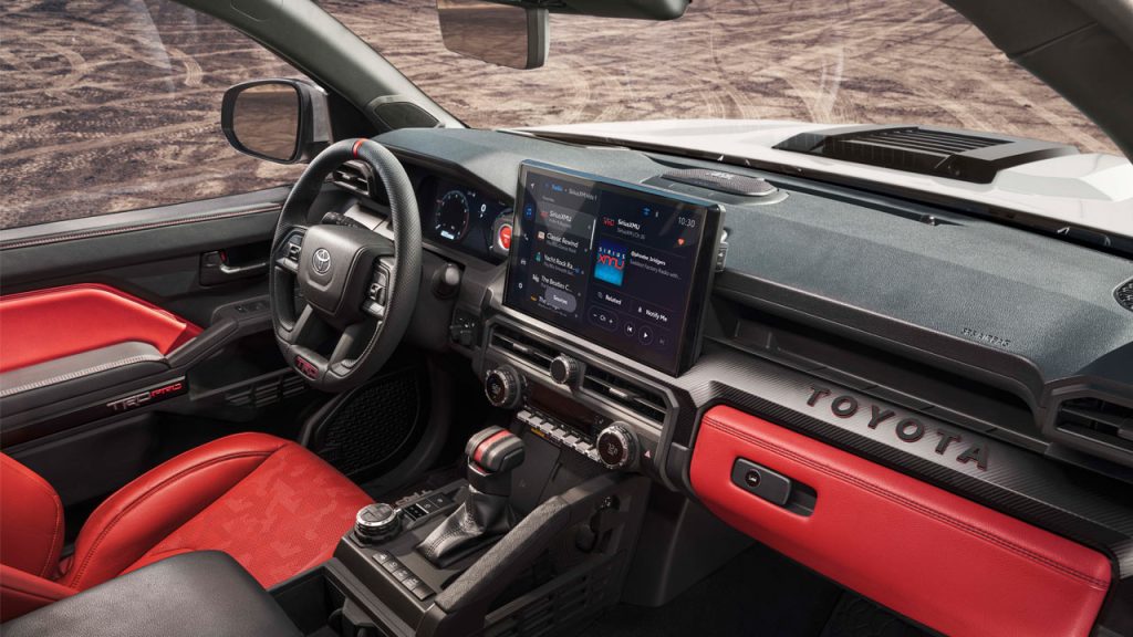Exclusively available on TRD Pro are these patent-pending IsoDynamic Performance Seats—which are claimed to offer a smooth, confidence-inspiring ride, thanks to an air-over-oil shock absorber system allowing for vertical and lateral seat movement simultaneously to dampen body movement and stabilize the head and neck to keep alignment with the spine. This dampening effect is tunable based on body mass and occupant preference and can be bypassed, if desired, via levers on the seatbacks, the company said.