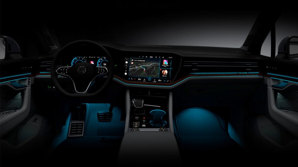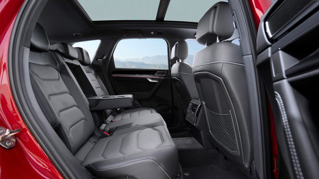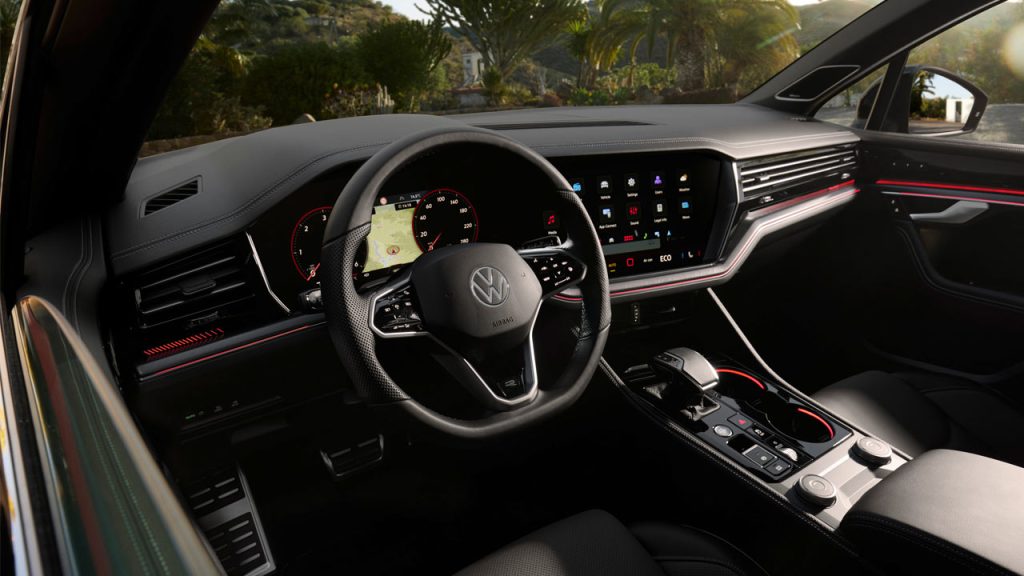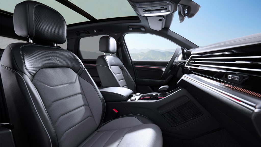 The Touareg R eHybrid sits on top of the range—literal or otherwise, as it rides on 20-inch ‘Braga’ alloy wheels. The wheels hide blue-painted calipers with a silver R logo. R logo projection via exterior mirror housings and a panoramic sunroof are some of the other key highlights of the eHybrid.