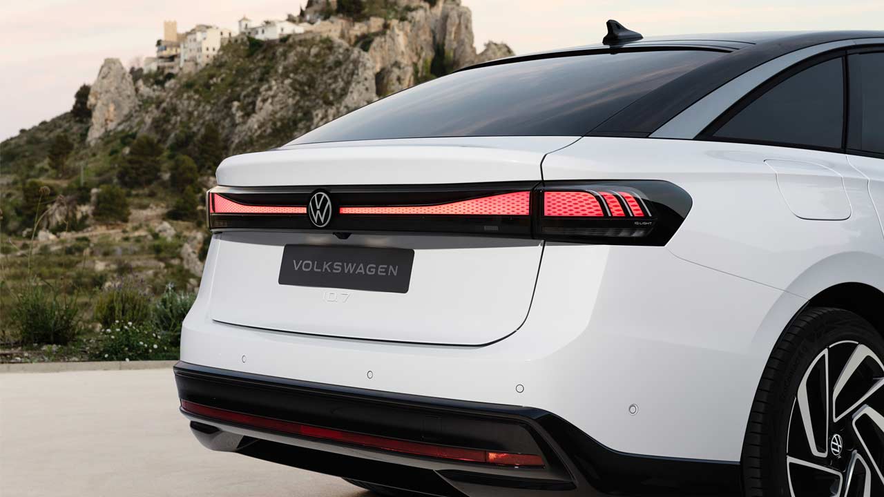 The IQ.Light matrix LED headlights perform a winking animation as the owner approaches the vehicle. The optional 3D LED taillights also perform an animated sequence with dynamic turn signals. Volkswagen still classifies the ID.7 we’re seeing here as “close-to-series study”, which means we don’t have complete details yet.