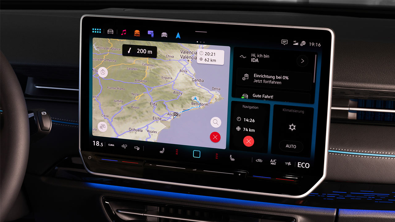 Assistance systems include Travel Assist with swarm data that can among other things support assisted lane changing on the multi-lane motorway at speeds over 90 km/h (56 mph). The ID.7 also boasts parking with a memory function over a distance of up to 50 metres. The driver can either remain sitting in the ID.7 or monitor the parking procedure from outside the vehicle using the smartphone app.