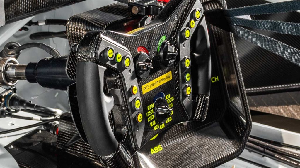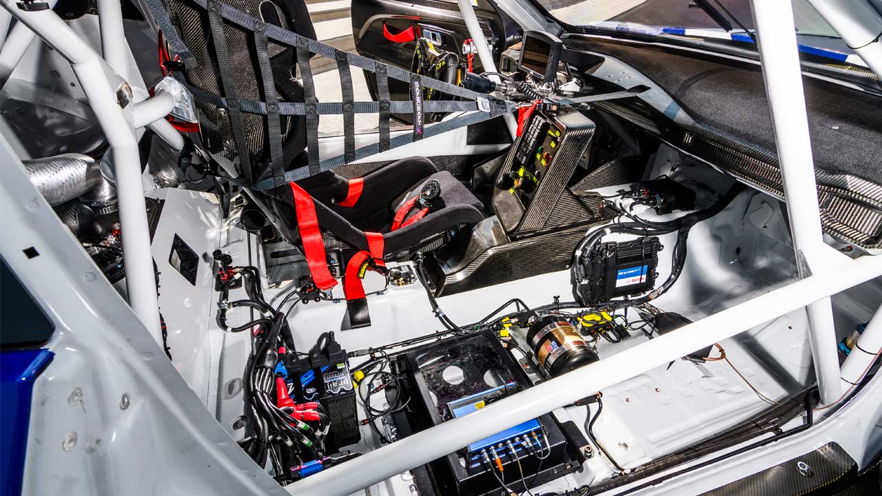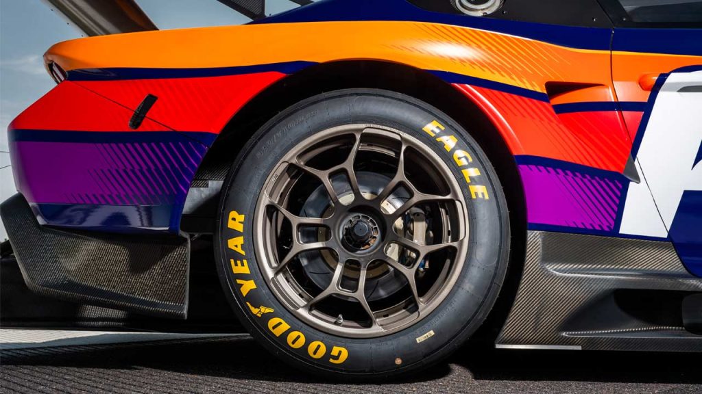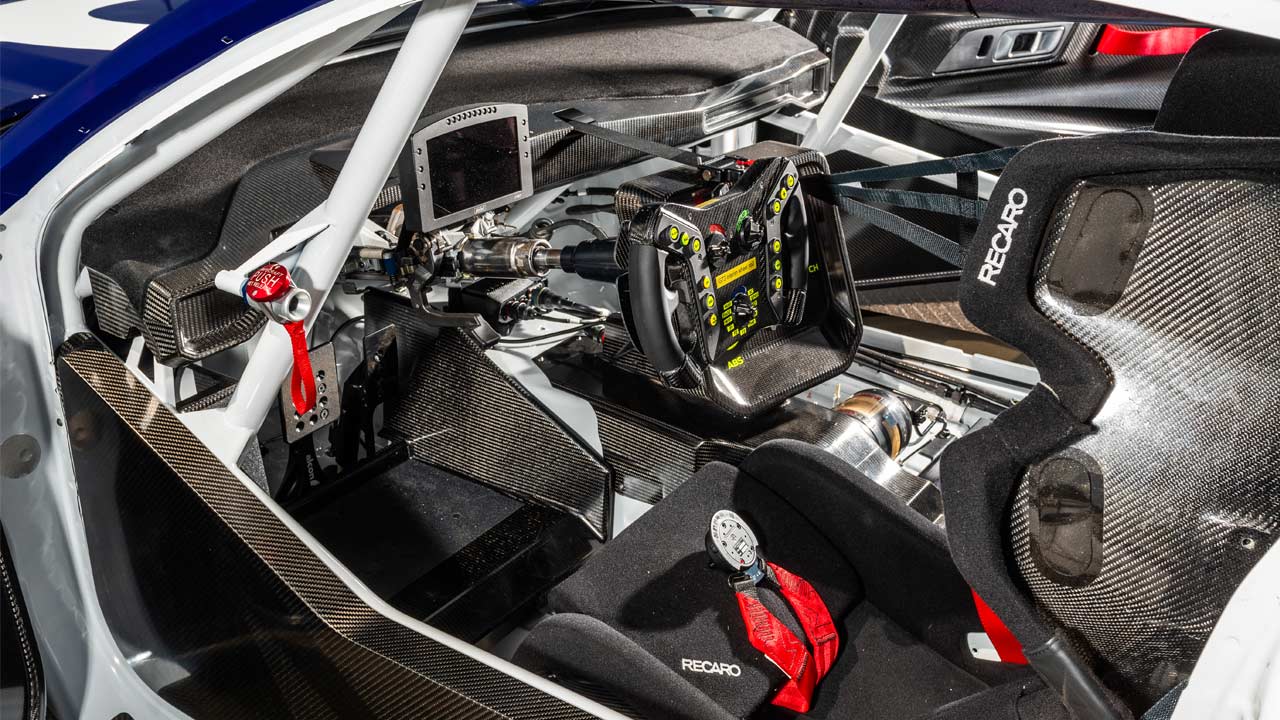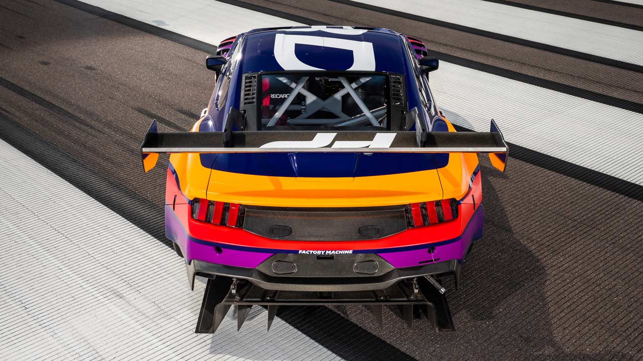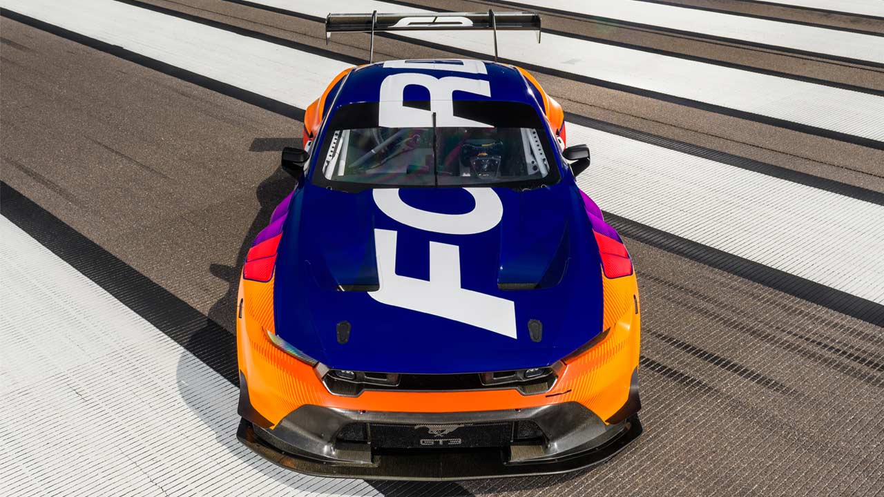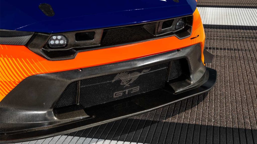 The Mustang GT3 has been blessed with a generous application of carbon fibre, including the body panels and aero elements. The race car also boasts a bespoke short-long arm suspension and a rear-mounted transaxle gearbox.
