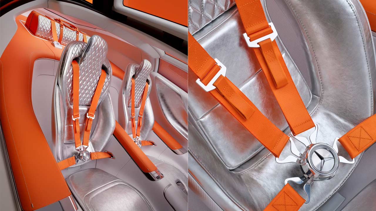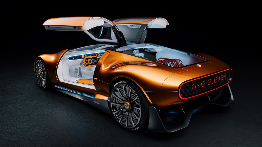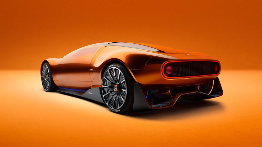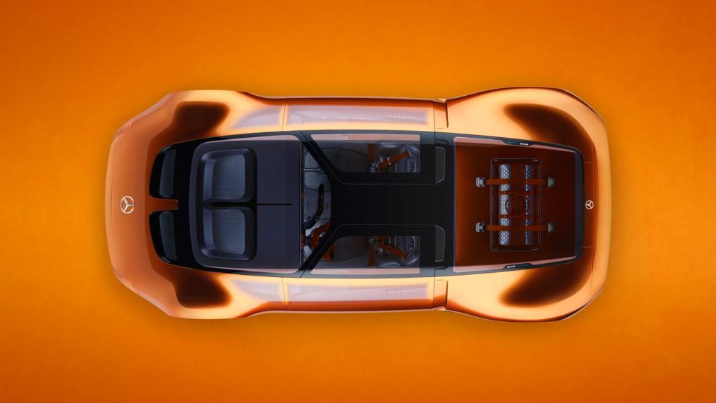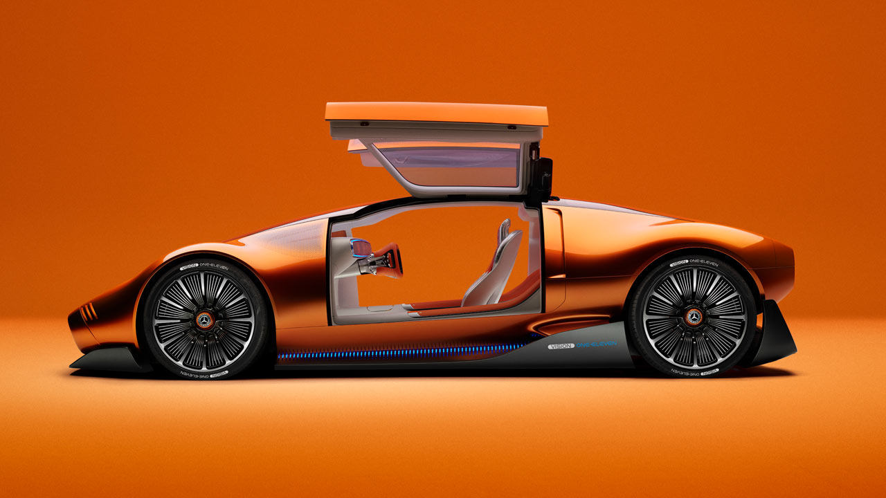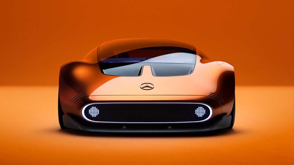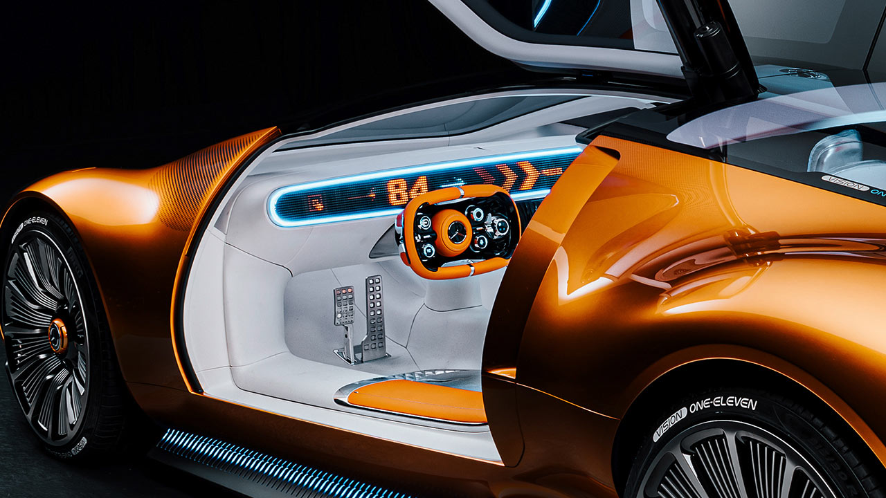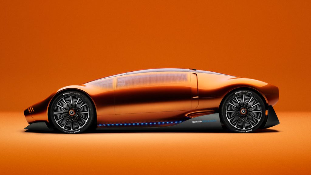 Yes, the original car gives off DMC DeLorean vibes, but the latter debuted over a decade earlier. But anyway, the Vision One-Eleven is painted in copper-orange alubeam—which again, is a reference to the color on the C 111. In case you didn’t notice, the side windows are opaque from the outside and camouflaged by a pixelated pattern.
