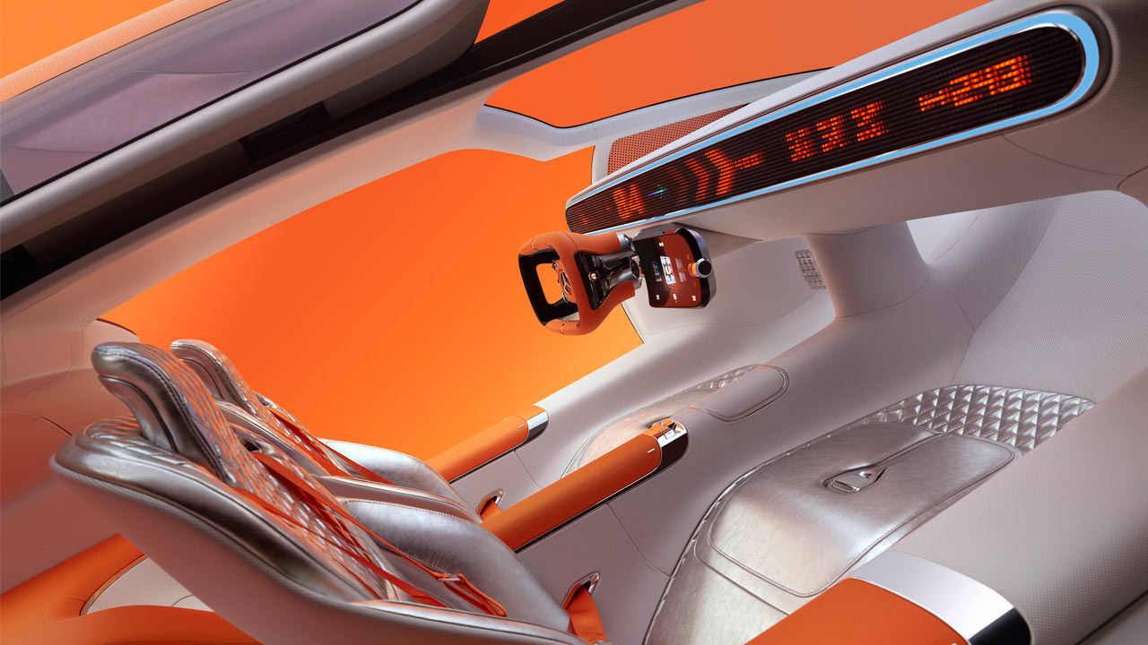 On the inside, again, the designers have tried to create a fusion of analogue and digital worlds. There’s a 3D pixel display stretching across the full width of the dashboard. Besides showing the current speed, the display shows digital art pieces as a coarsely rasterized stream of QR codes in the style of “early digital” news tickers. But then, the corresponding real image appears on the high-resolution screen next to the steering wheel. The steering wheel looks rather complicated, but apparently, that’s the only highly complex feature in the interior.