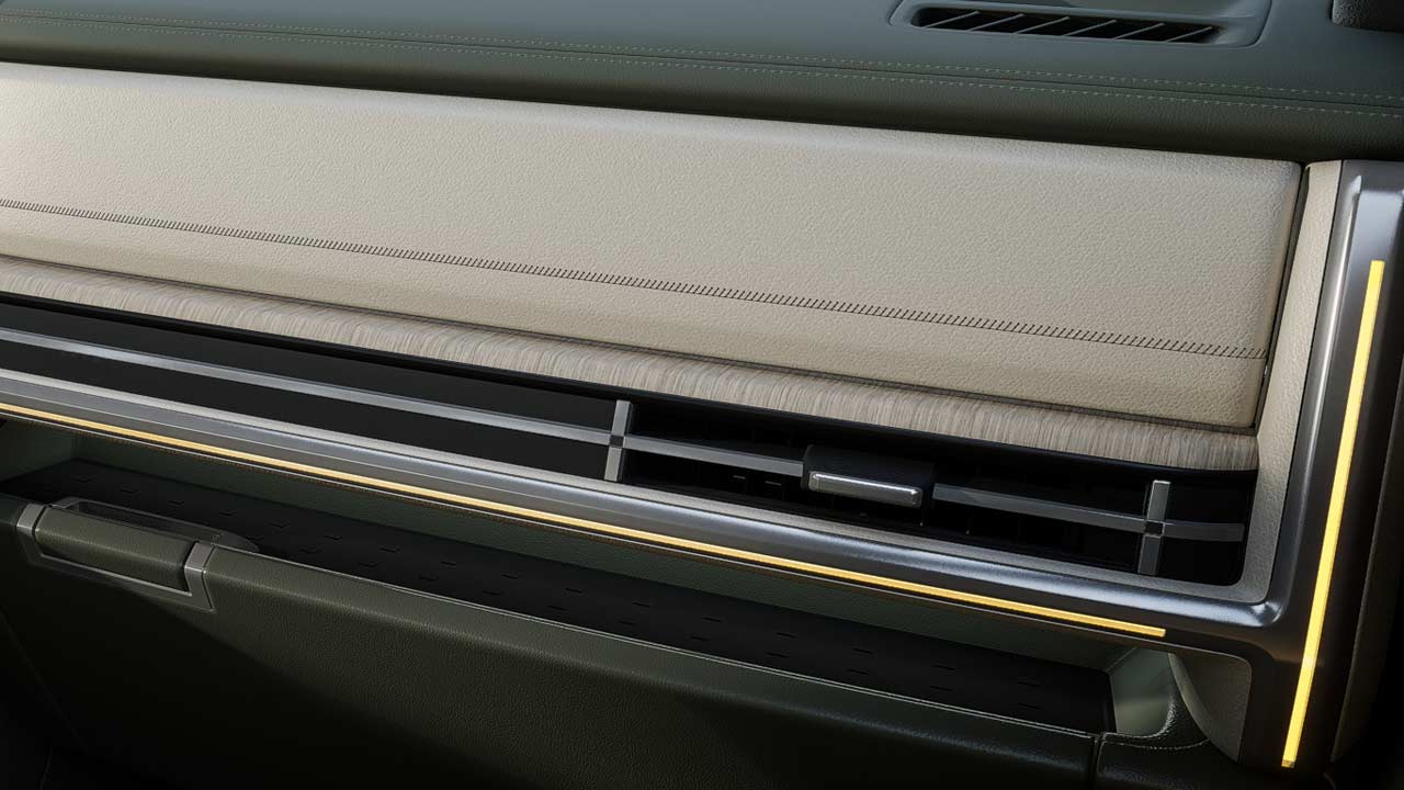 Materials used include soft-touch wood-patterned garnishes and Nappa leather for seats. The suede headliner, floor mats, and second- and third-row seatbacks are made from recycled plastic, while the crash pad and door trim covers are made from eco-friendly leatherette.