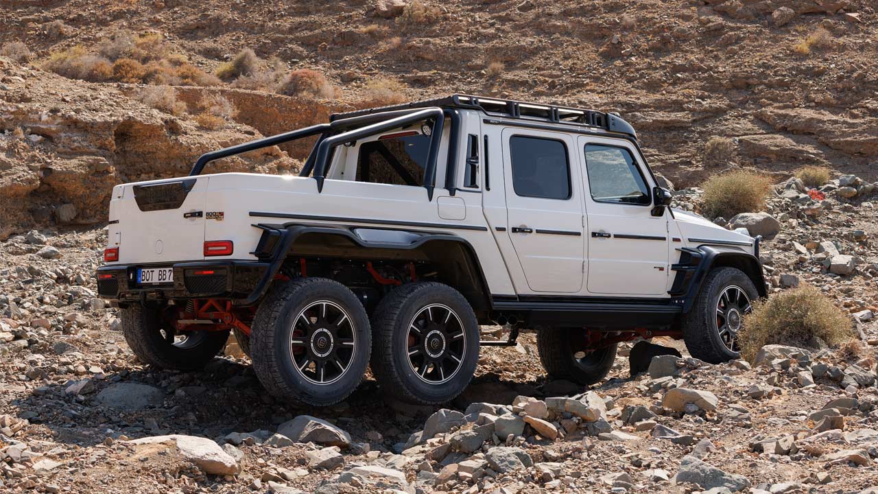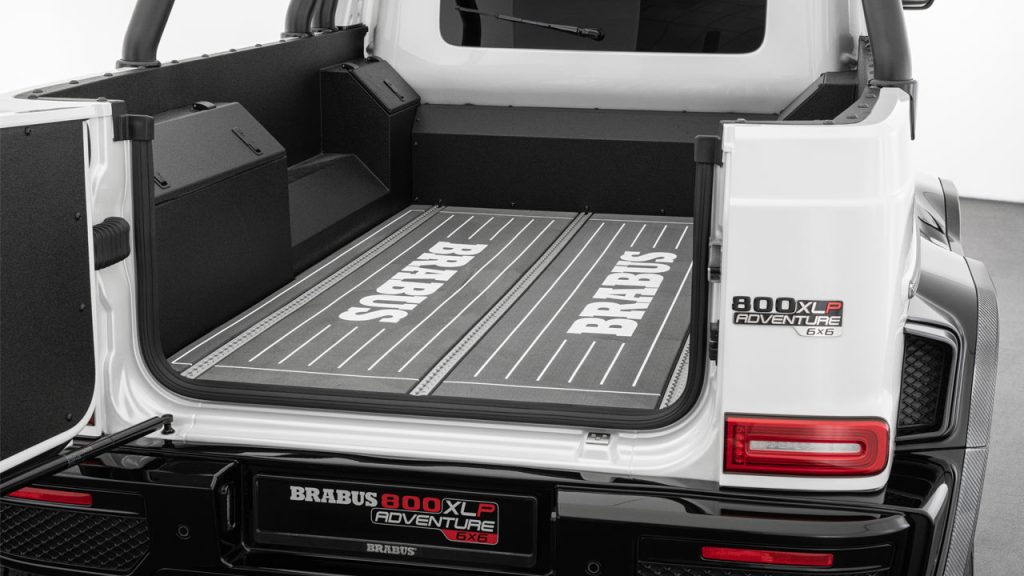As you can probably tell, the Brabus XLP 800 6×6 Adventure is based on the AMG G 63. The obvious differences are, of course, 6 wheels on portal axles and a bed. Which meant that the donor car’s ladder frame needed to be lengthened with the help of an additional steel module—which is claimed to give the frame the same torsional rigidity as the production vehicle and also incorporate the four rear wheel suspensions. Brabus says that the dampers and springs of the six suspension struts were calibrated specifically to the vehicle’s weight and huge ground clearance (18.6-inches). The damping rate can be adjusted from inside the cockpit.