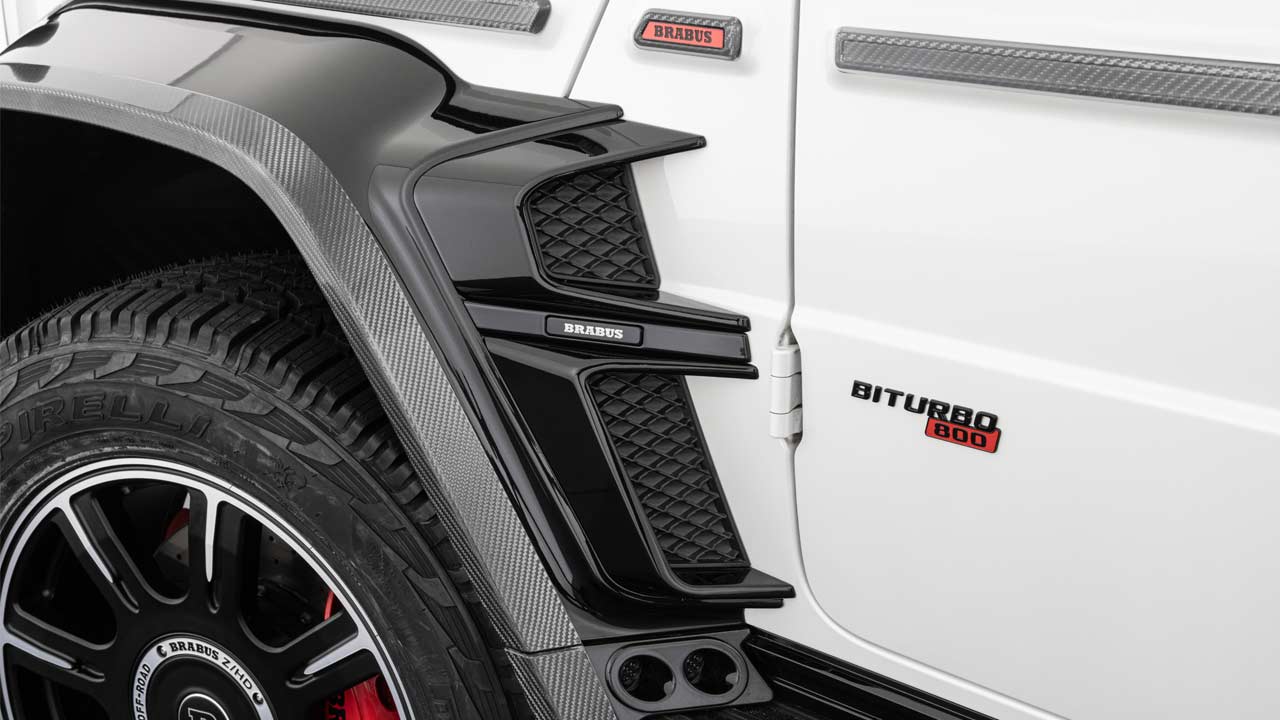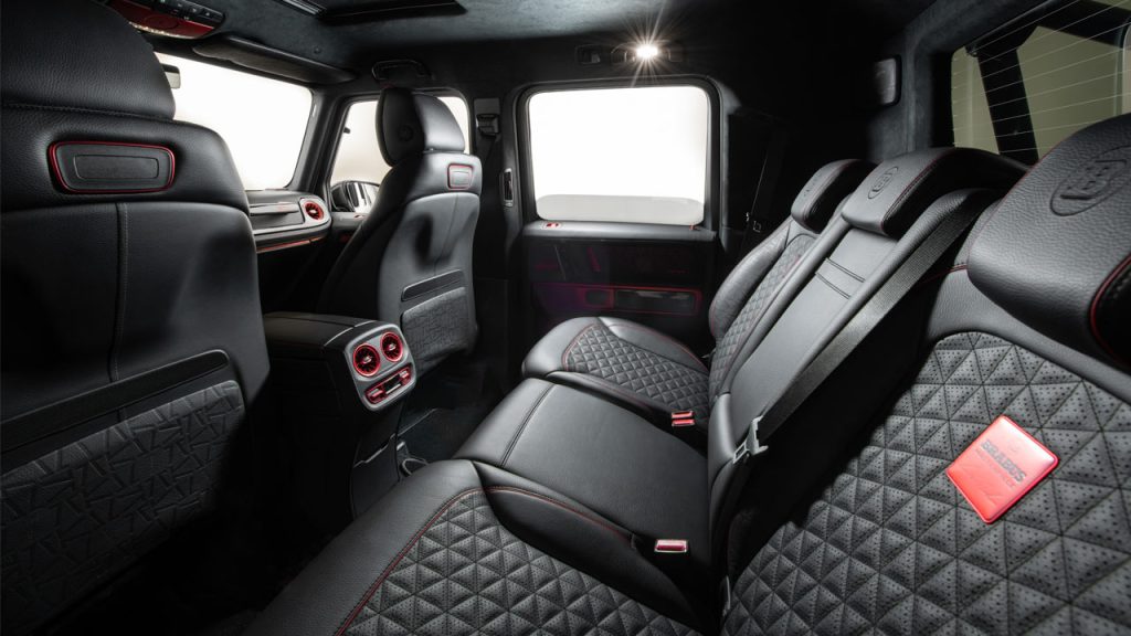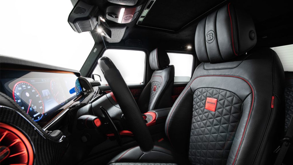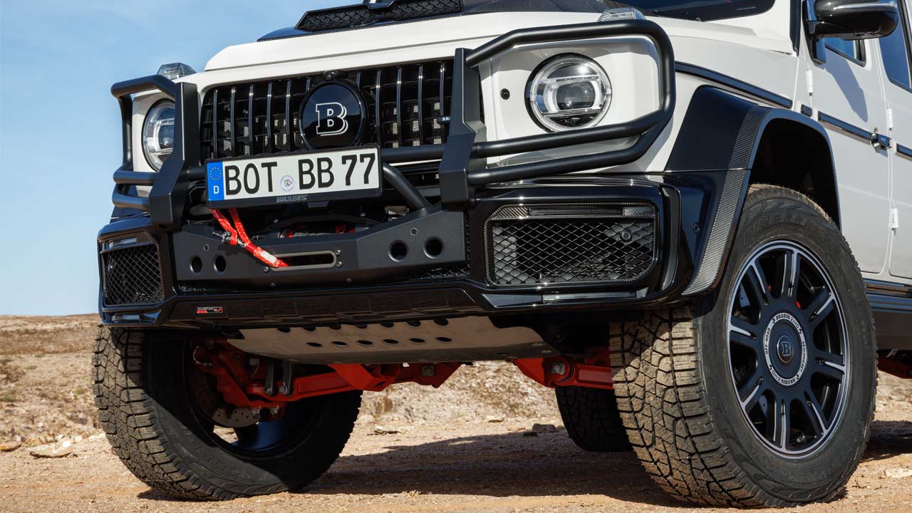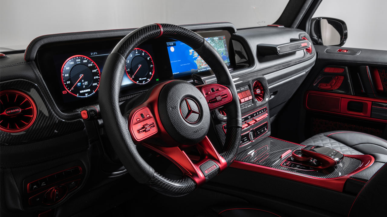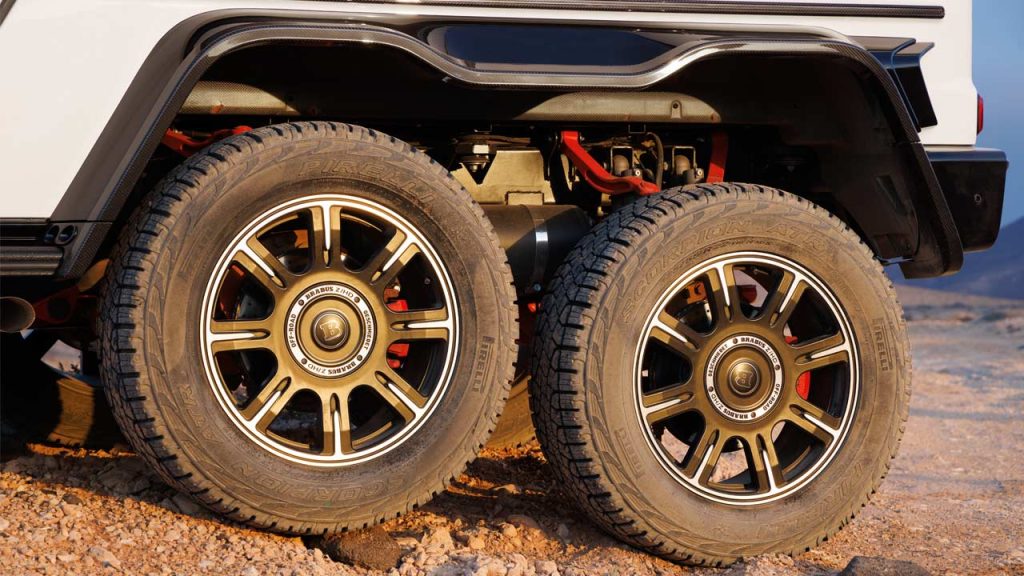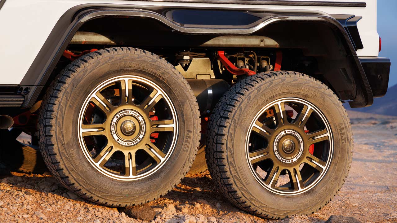 Reinforced axle housings and all red-painted control arms are made of high-strength aluminum. The Adventure truck rides on 22-inch Brabus Monoblock Z/HD wheels that were engineered specifically for the portal axles with an eight-lug bolt pattern; these wheels are wrapped with 325/55 all-terrain tyres. All six wheels are connected to a central tire inflation system for lowering and increasing the tire pressure on the touch control panel.