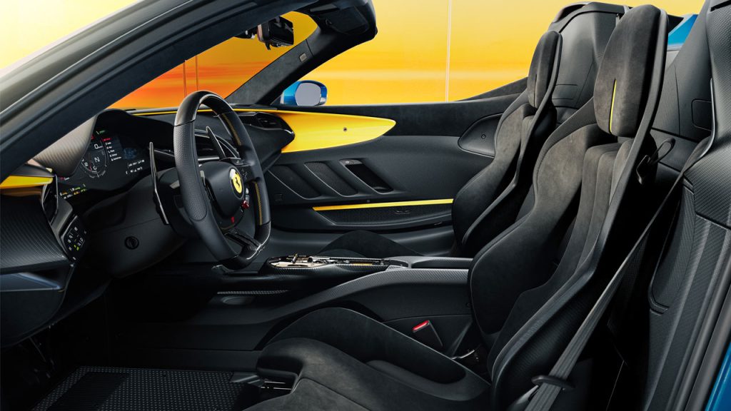 As for vehicle dynamics, you got the ABS EVO controller, a 6W-CDS sensor (can measure both acceleration and speed of rotation on all three axes), Ferrari Dynamic Enhancer 2.0, electronic Side Slip Control (eSSC) 1.0, and extra boost control logic to deliver additional power in short bursts. Ferrari claims that there’s a 9% improvement in lateral performance (Ay max) compared with the SF90 Stradale in high-speed handling conditions, mostly as a result of downforce. Furthermore, the roll rate was reduced by 10% ensuring better body control.