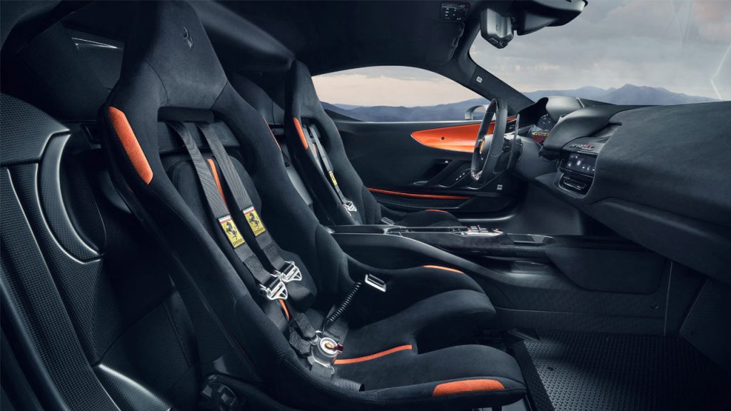 On the inside, well, the SF90 XX models don’t look all that hardcore/stripped-down compared with their road-going siblings. The upper part of the dashboard is trimmed in Alcantara, while the lower part is trimmed in technical fabric. As part of weight-saving measures, the door panels, tunnel and mats, are now simpler in their shape. Carbon fibre was used only for functional areas. Those racing seats are comprised of a carbon fibre tubular structure with cushion supports. The backrest rake mechanism has been integrated into the seat using elastic trim materials—which hide the separation between the backrest and seat squab, which Ferrari says has contributed to saving 1.3 kg (2.9 lbs) per seat compared with the SF90 Stradale’s single-piece seat.