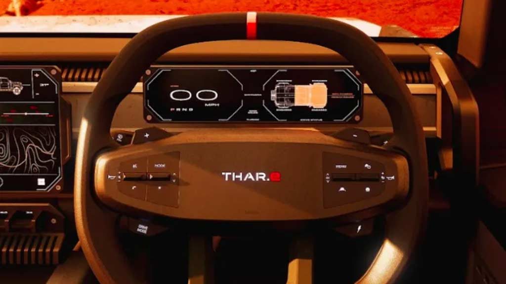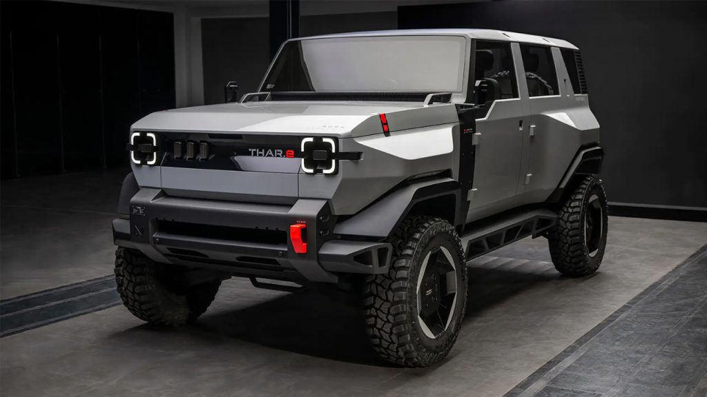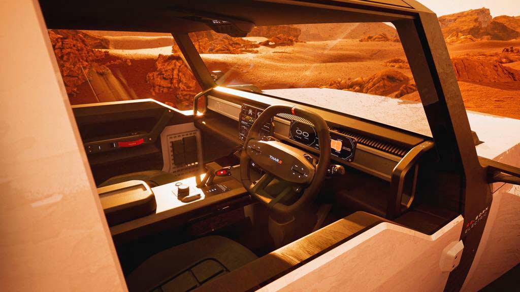And apparently, that’s where the Vision Thar.e (concept) comes into the picture. It is part of the company’s Born Electric lineup of electric vehicles – to be launched in the coming years. When it comes to styling, the Thar.e (or, electric Thar, if you prefer) doesn’t really look like an electric version of the Thar we all know and love. It looks more like an armored Defender—from rear-three-quarter angles, and from the front-three-quarter angles, it looks like some upcoming product from a startup. However, notice that the electric Thar concept is being showcased in a 5-door guise.