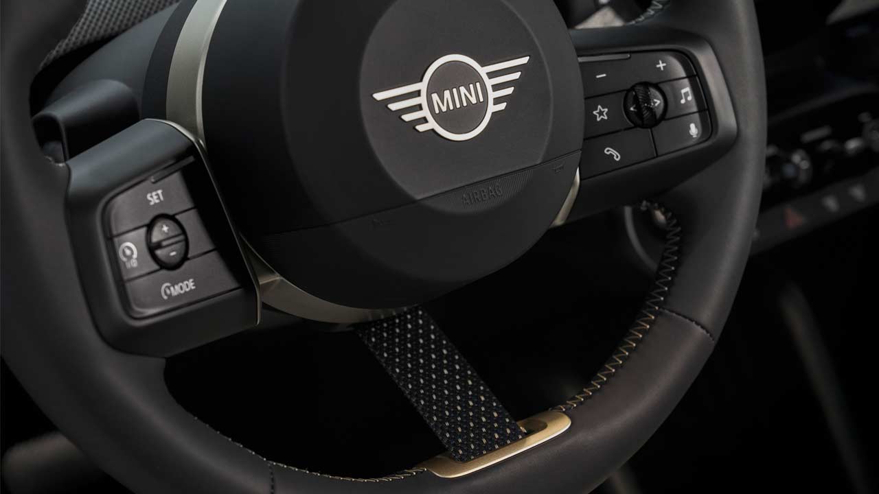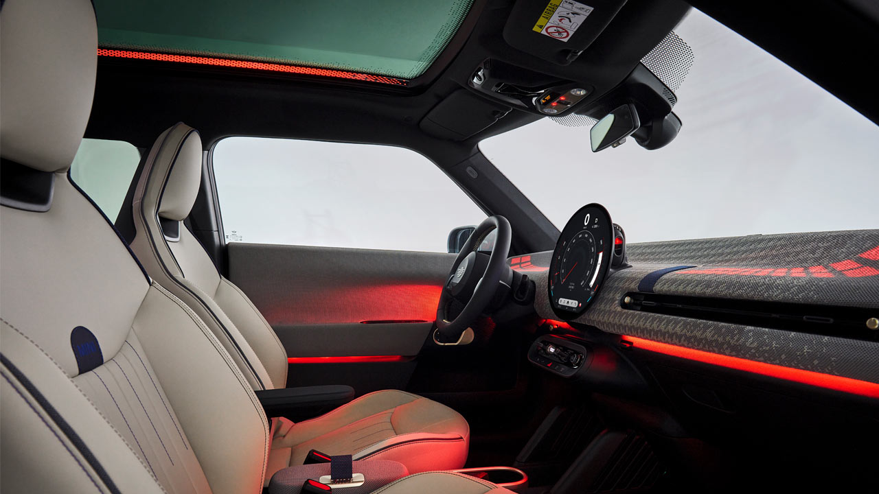 Inside, well, we saw the inside of the new Mini Cooper over a month ago where the key highlight was a circular OLED display. Read more about that here. Other key highlights inside include dashboard and door panels with knitted surfaces made of recycled polyester; a three-spoke steering wheel with a textile strap (Classic trim onwards); black sports seats (Essential trim); 2D knitted textile material (Classic trim); a two-tone houndstooth pattern on the knitted-textile-upholstered dashboard (Favoured trim); perforated Vescin sports seats (Favoured trim), and of course, multi-colored knitted textile and black synthetic leather with red stitching for JCW.
