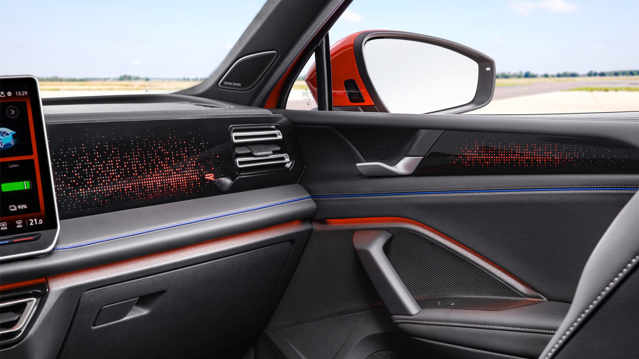 Inside, things look very… techuan. I mean, there’s a new 10.2-inch Digital Cockpit Pro, an optional 15-inch Discover Pro Max touchscreen (12.9-inch for lesser trims), an optional head-up display, a 15-watt wireless charging pad, and some fancy ambient lighting. You can also notice a new multifunctional rotary dial in the centre console with an integrated OLED display. And, like in the Volkswagen ID. models and the new Passat, the gear selector has moved to the steering column.