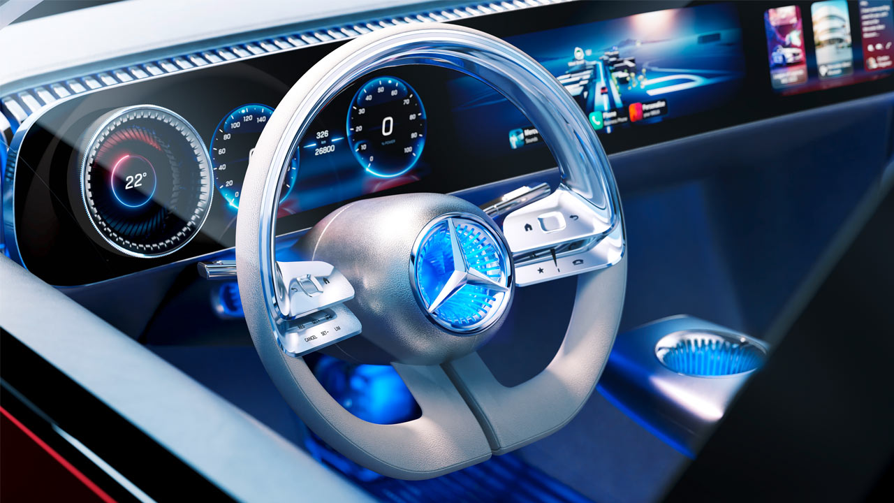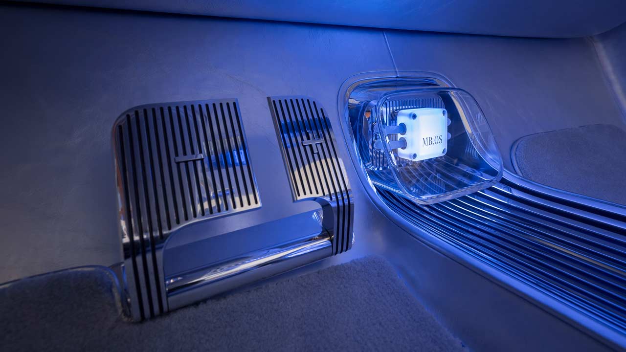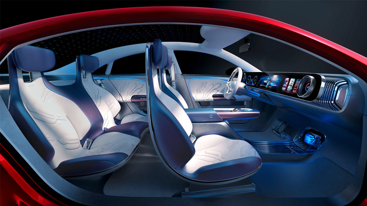 Inside, it is even more concepty than the outside. There are some strange-looking seats and sci-fi-looking elements, but the dashboard features MBUX Superscreen with AI functionalities, and as you can also probably see, there are large air vent-like circular knobs featuring an integrated display. Also, Mercedes-Benz is developing its own operating system called MB.OS—which is said to be a digital foundation for upcoming electric vehicles.