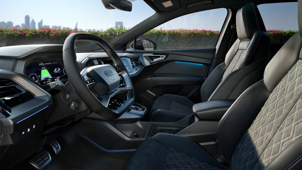 Another important update is that all models now get a 77 kWh (net) battery pack, meaning the 52 kWh option is no longer available. Thanks to optimized cell chemistry, the RWD models can handle DC fast charging up to 135 kW while the quattro models can take up to 175 kW. As for range, the Q4 Sportback 45 e-tron (RWD) is claimed to offer a WLTP range of up to 562 km (349 mi).