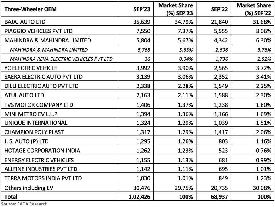OEM-wise market share data for September 2023 with YoY comparison: