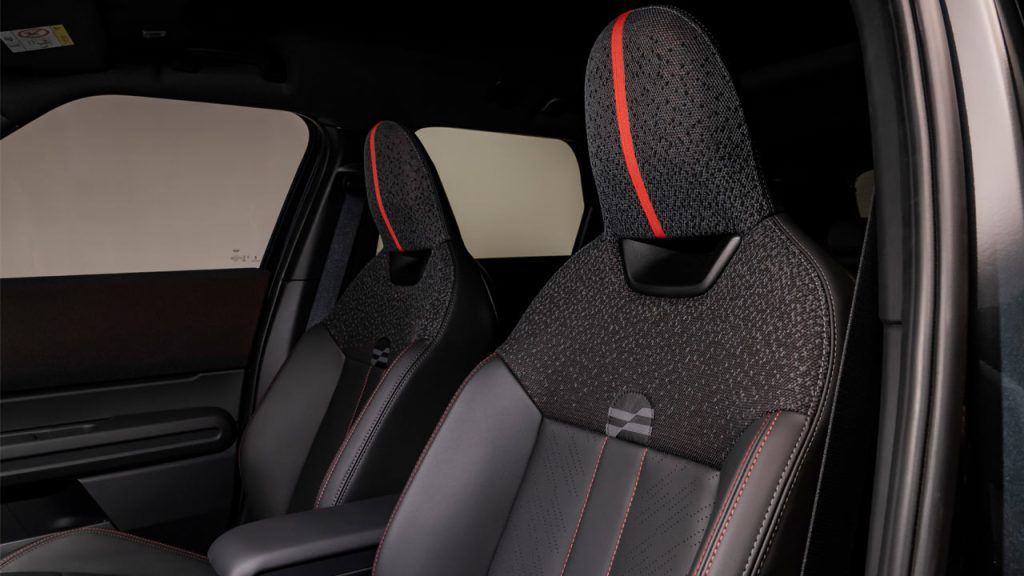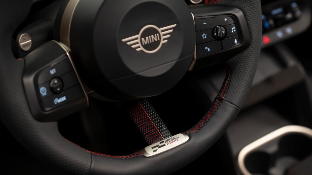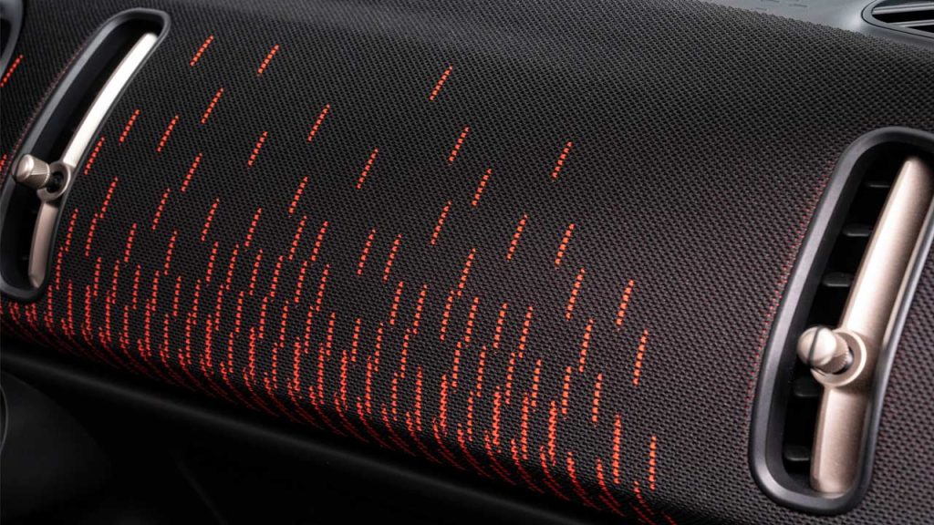 Inside, the dashboard is upholstered in a material made from recycled polyester, and as you can see, it has some interesting patterns going on. Other key highlights include JCW sports seats, heating function for front seats, slide adjustable rear seats (by up to 13 cm), JCW-branded heated steering wheel, OLED display, Comfort Access, and Mini head-up display. The panoramic sunroof is part of an optional package.