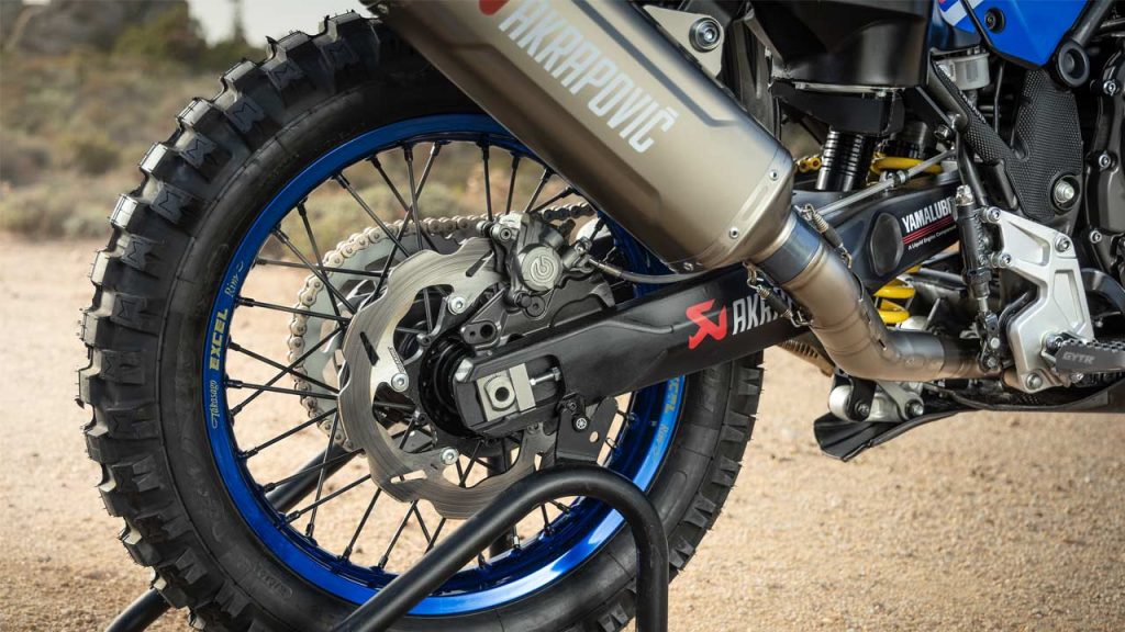 The second one is the Ténéré 700 World Raid GYTR Handling kit, which includes race-tuned 48 mm adjustable KYB closed cartridge forks with an increased stroke of 270 mm; a GYTR triple clamp assembly; a fully adjustable steering damper (25 settings); a fully adjustable Paioli shock absorber; GYTR rally wheels; bigger 300 mm disc at the front; Brembo calipers; GYTR Handling kit ECU that allows for the deletion of the ABS system and immobilizer; a lightweight chain and sprocket set with revised ratios; a new radiator assembly consisting of a bigger radiator and separate oil cooler; a black anodized GYTR radiator guard, and a GYTR high front fender.