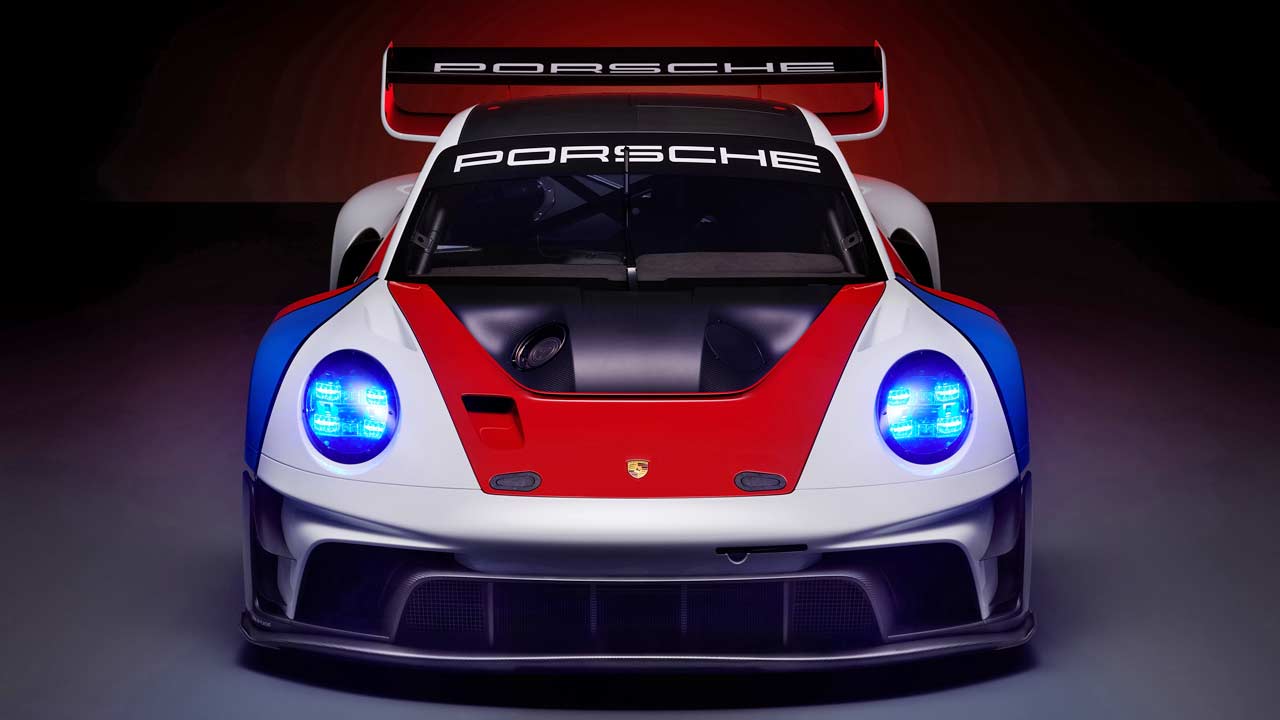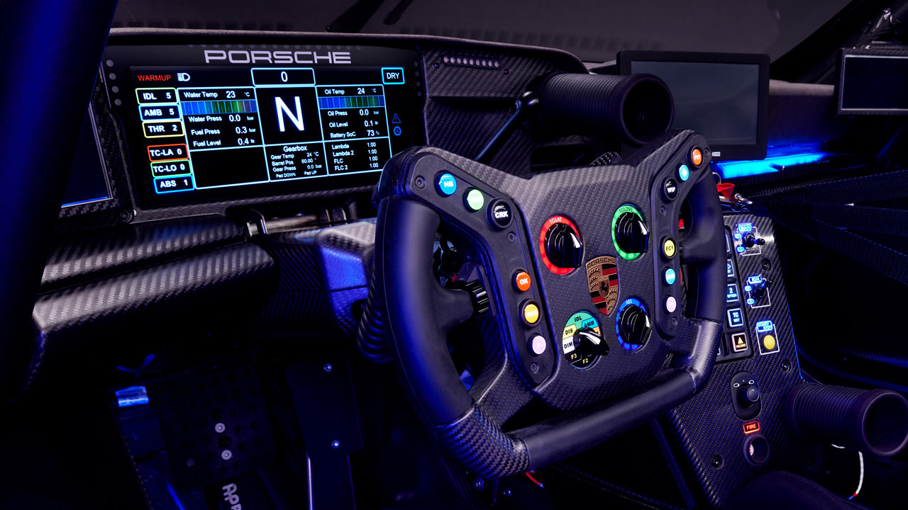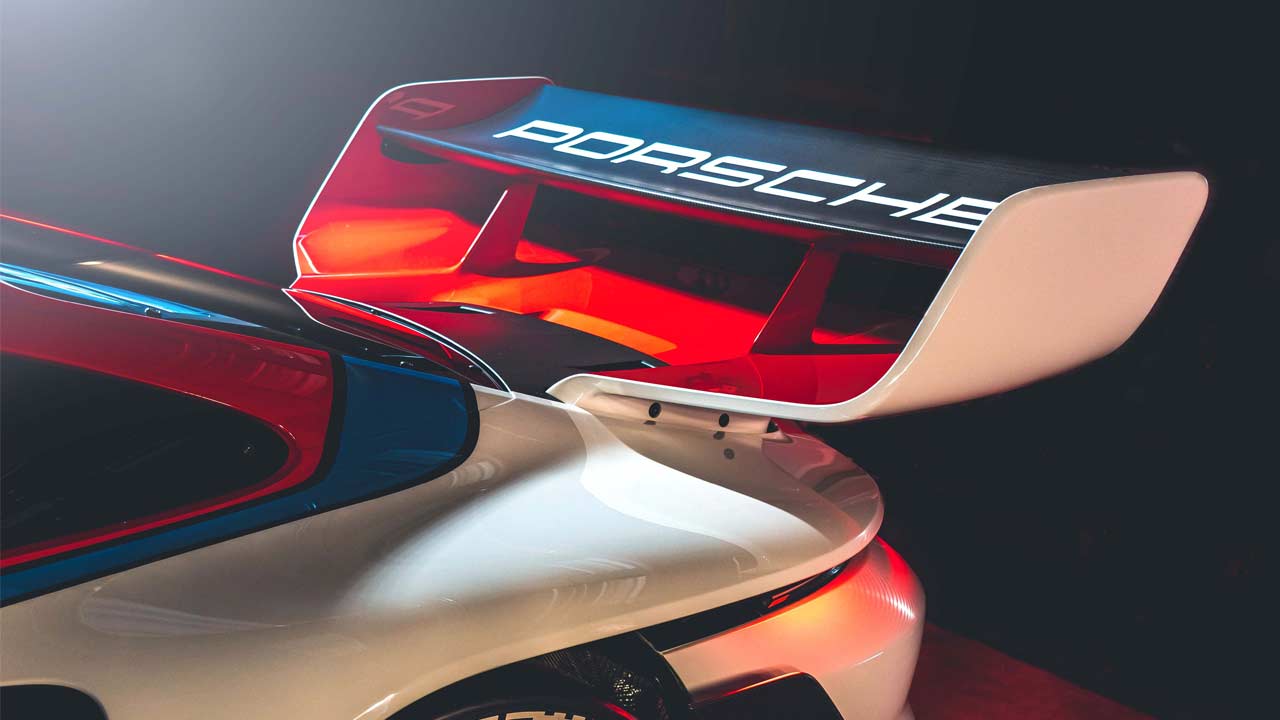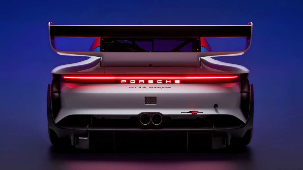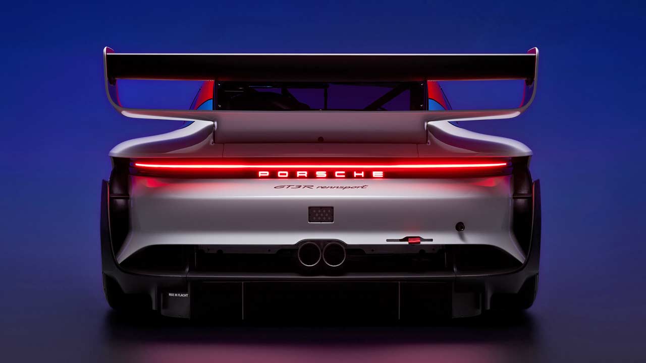 And, one of the other noticeable differences is, of course, the gigantic rear wing, inspired by that of the legendary Brumos Porsche 935/77, with which Peter Gregg (U.S.), together with the Toine Hezemans (NL) and the Rolf Stommelen (DE), took the 7th overall victory for a Porsche at the 24 Hours of Daytona in 1978. At the rear, you can also notice the illuminated Porsche lettering underneath the light bar. As in the 911 GT3 R, the twin tailpipes remain in the center.