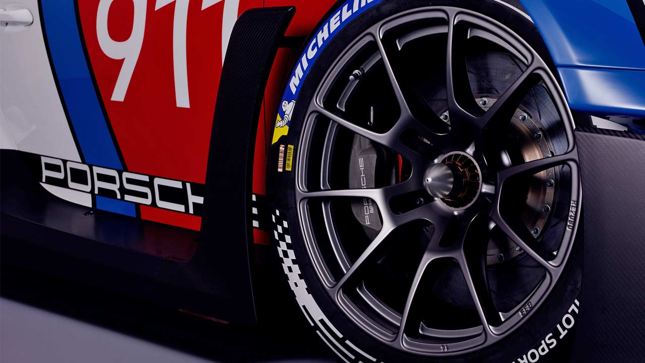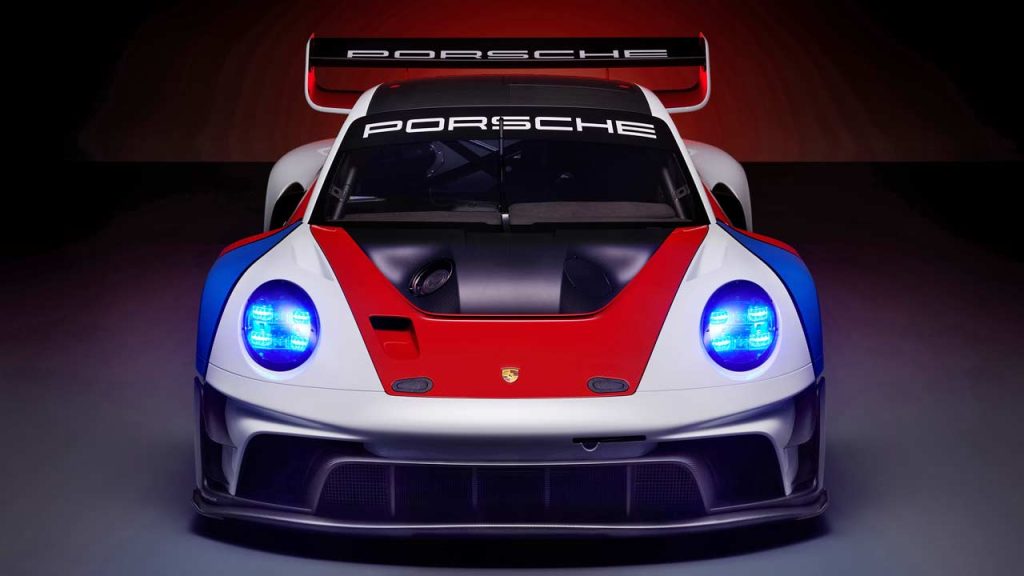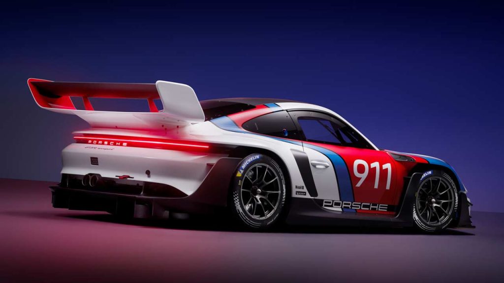 The 4.2L (4,194 cc) water-cooled six-cylinder boxer engine revs up to 9,400 rpm in this application and delivers a power output of 456 kW or 620 metric hp, which is 55 metric hp more than in the GT3 R. The engine can run on E25 as well. The 6-speed sequential gearbox gets some minor modifications. The ratio of the 4th, 5th and 6th forward gears corresponds to the Daytona set-up of the GT3 racing car. In 6th gear, with an engine speed of 9,000 rpm, it gives the car a top speed that is around 20 km/h (12.4 mph) higher than the shorter FIA homologated gear ratio of the GT3 R, the company added.