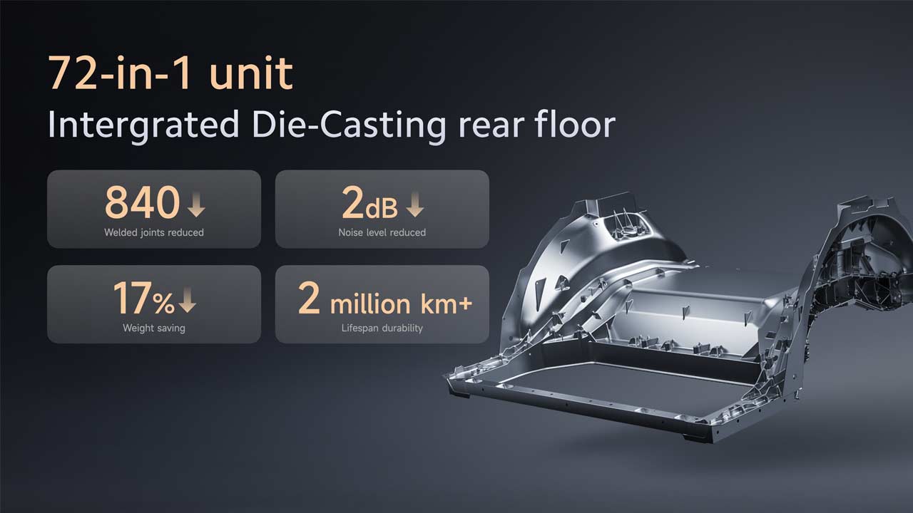 Understandably, Xiaomi talks more about the technology rather than the car itself. The company has revealed the Xiaomi Die-Casting T9100 cluster and a die-casting alloy material called Xiaomi Titans Metal; both claimed to be self-developed. The company says that the T9100 covers an area of 840 m² with a total weight of 1050t and locking force reaching 9100t. In addition, a quality judgment system is said to be capable of completing inspections of individual pieces within 2 seconds, offering an efficiency 10 times higher than manual inspection. The rear underbody, for example, integrates 72 components into one, reducing welded joints by 840, decreasing overall car weight by 17%, and significantly reducing production hours by 45%.
