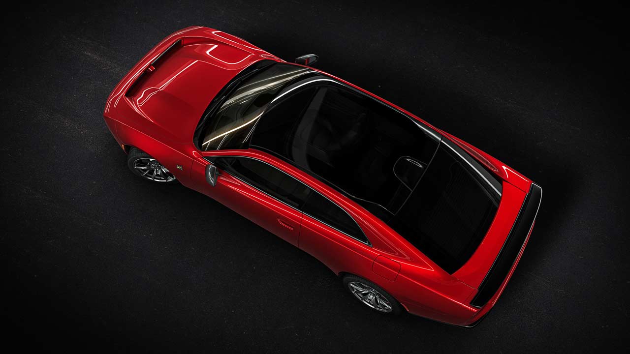 Both two- and four-door models feature clean and fuss-free styling. The front fascia features a light bar connecting the J-shaped running lights, and if you look at the top-down view, you’ll notice that there’s a pass-through area called R-Wing—which is claimed to be patent-pending. Fender badging identifies the respective Charger Daytona Scat Pack and R/T models, and there are 9 new wheels featuring center caps and the Fratzog logo: