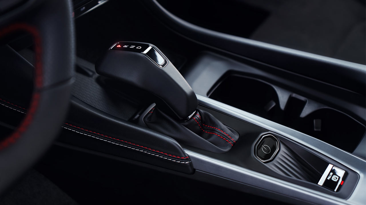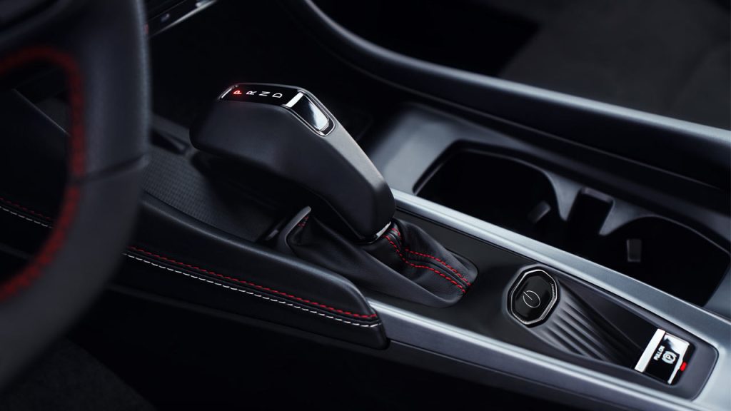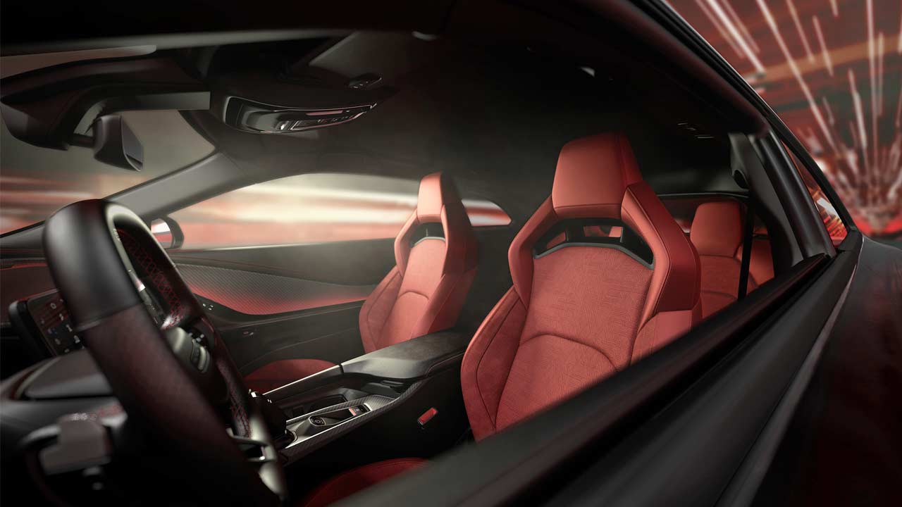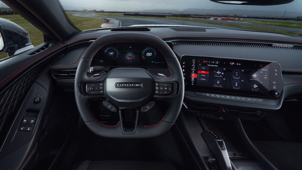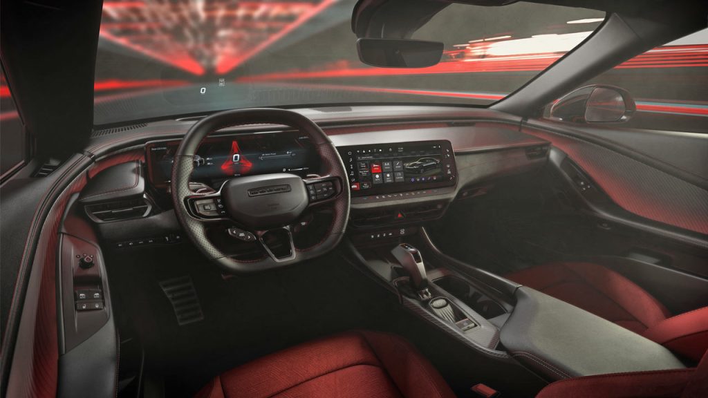 Key features inside depending on the variant include a 10.25-inch or optional 16-inch cluster screen, a 12.3-inch central touchscreen, wireless CarPlay/Android Auto connectivity, 64-color ambient lighting, a “pistol-grip” shifter, and 9-speaker or optional 18-speaker Alpine audio systems. An AR head-up display can also be found in the options list. The Uconnect 5 touchscreen displays Performance Pages with key performance metrics such as timers, gauges, g-force, and propulsion system information. Cloth and leatherette seats are standard, but there are optional packages including Carbon & Suede Package.