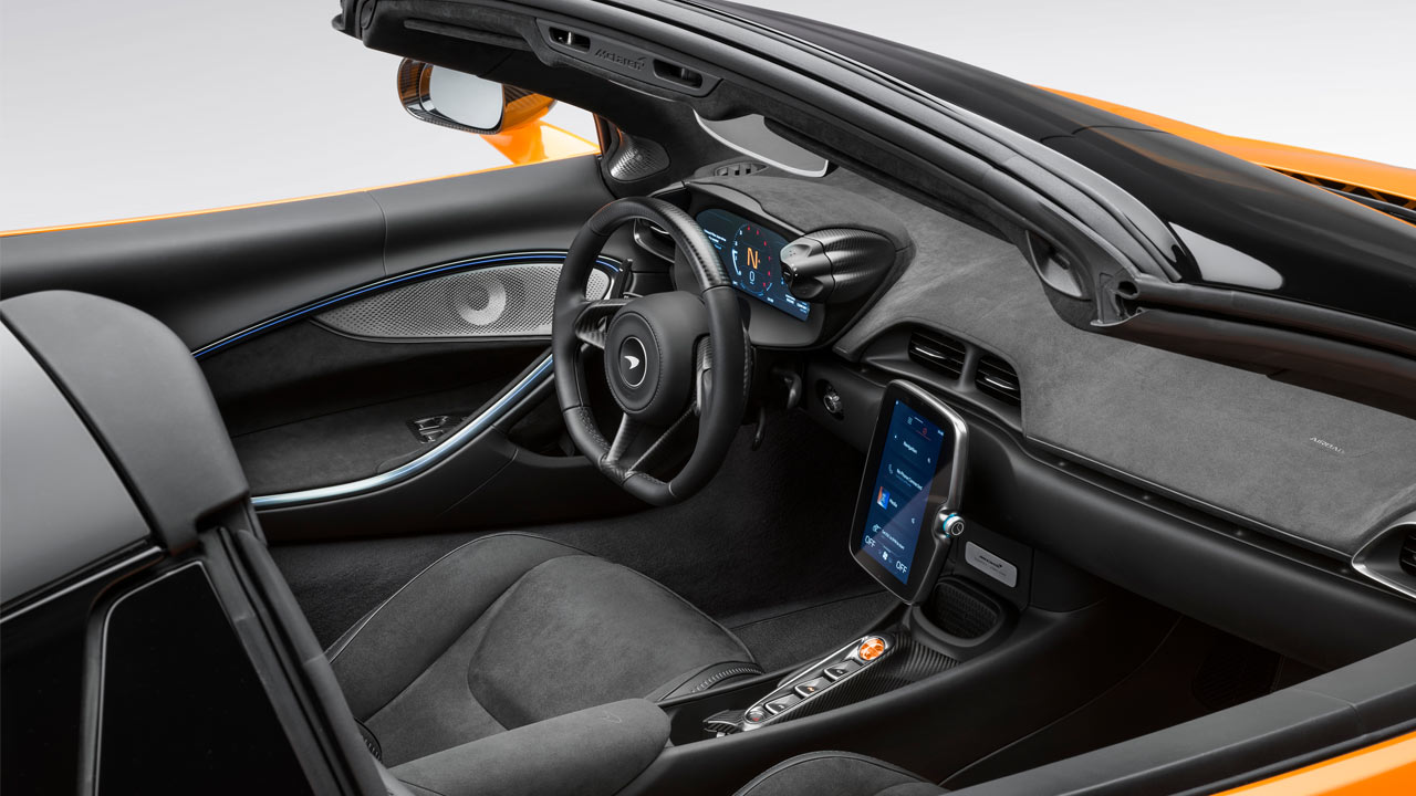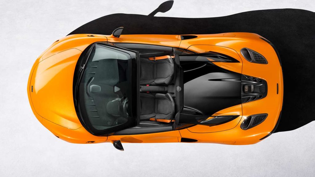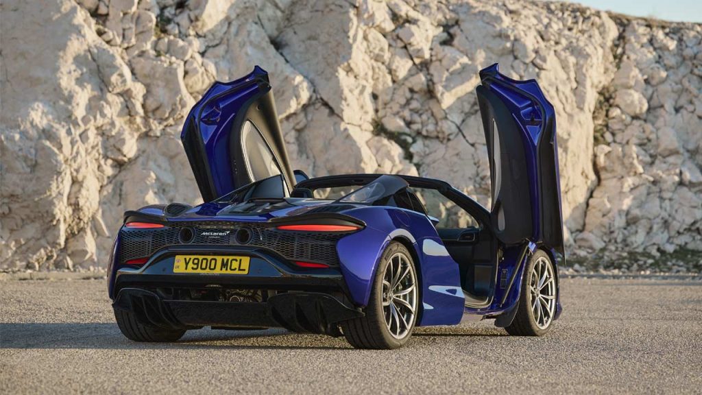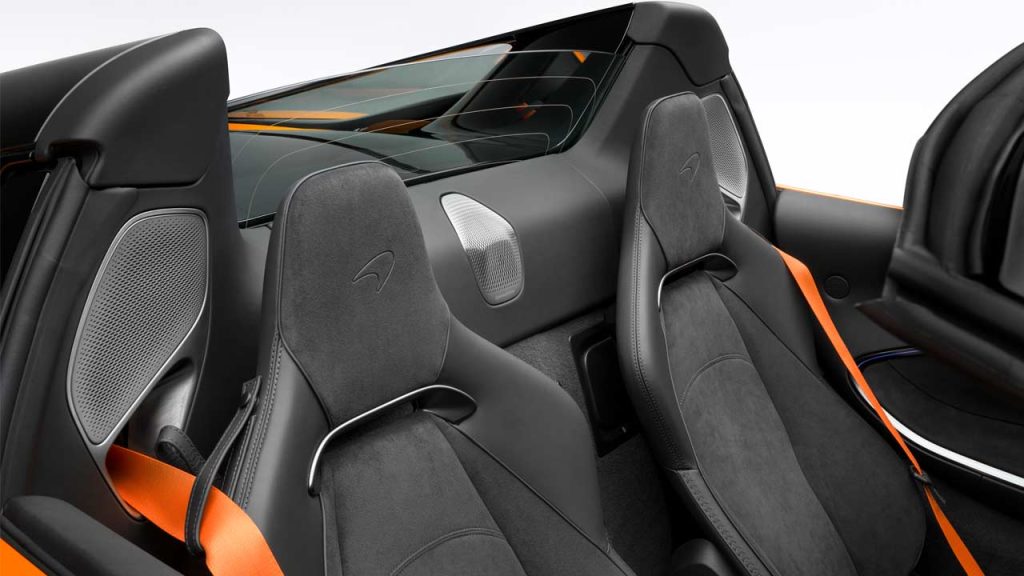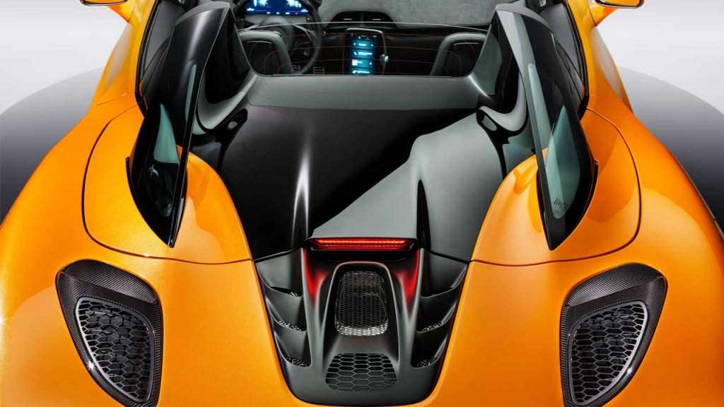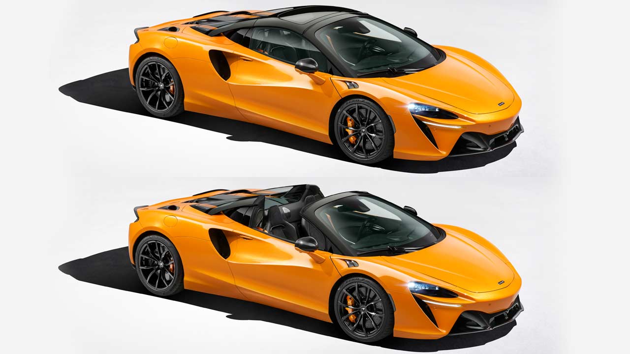 But no, McLaren claims that the Spider weighs only 62 kg (136.7 lbs) more than the Artura coupe (dry weight: 1,457 kg/3,212 lbs vs 1,395 kg/3,075.4 lbs), and most of that weight is accounted for by the RHT mechanism. But what about the extra stiffness, bracings, etc needed to compensate for the lack of a roof? Well, McLaren is confident that the McLaren Carbon Lightweight Architecture (MCLA) offers “a secure platform with no loss of rigidity when the fixed roof is removed”. Well, fair enough. BTW, that electrochromic glass panel on the RHT is an optional extra.