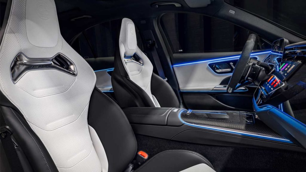Inside, you get electrically adjustable AMG sports seats as standard, upholstered in Artico man-made leather. AMG performance seats are optionally available. Nappa leather-upholstered AMG performance steering wheel is also standard.