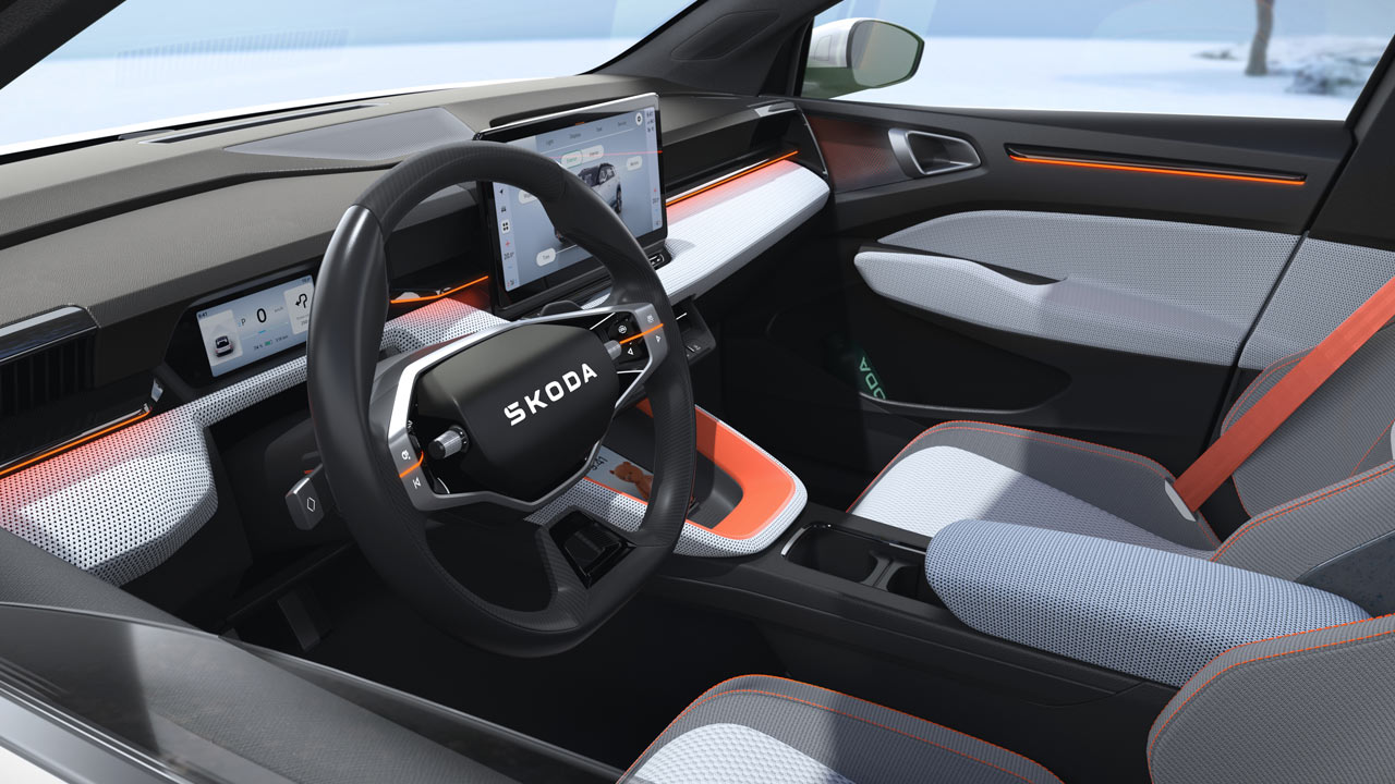 The interior design is rather minimalistic, as is the case with most VW Group BEVs. The new two-spoke steering wheel features new Škoda lettering as well as physical buttons, haptic scroll wheels, and of course, orange accents. A digital cluster is tucked within the dashboard, while there’s a rather large central touchscreen. Being a BEV means, of course, you can expect the use of sustainable materials (a.k.a recycled/repurposed materials) inside. And, Skoda claims a luggage space of up to 490 litres.