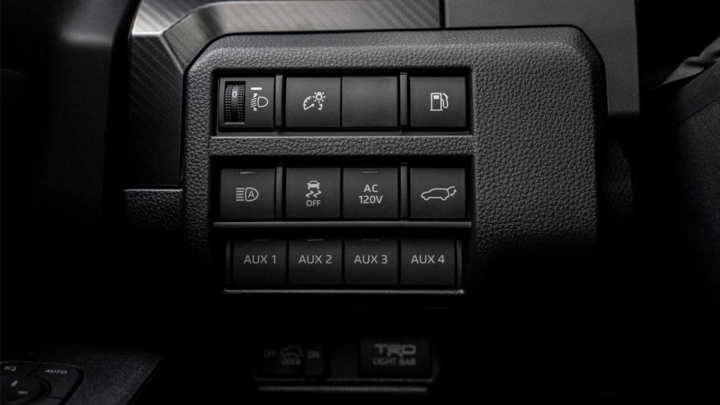 The 4Runner TRD Pro comes standard with a TRD-tuned FOX suspension and 33-inch Toyo all-terrain tires. The 4Runner Trailhunter boasts ARB’s Old Man Emu (OME) 2.5-inch forged shocks with rear external piggyback remote reservoirs, along with a co-designed ARB Roof Rack. The OME shocks along with the 33-inch Toyo Open Country A/T tires raise Trailhunter by an additional 2-inches at the front and 1 & 1/2-inches at the rear. This model also gets rock rails and high-strength steel skid plates. Both TRD Pro and Trailhunter get a bumper-integrated 20-inch LED light bar with color-selectable RIGID LED fog lights.
