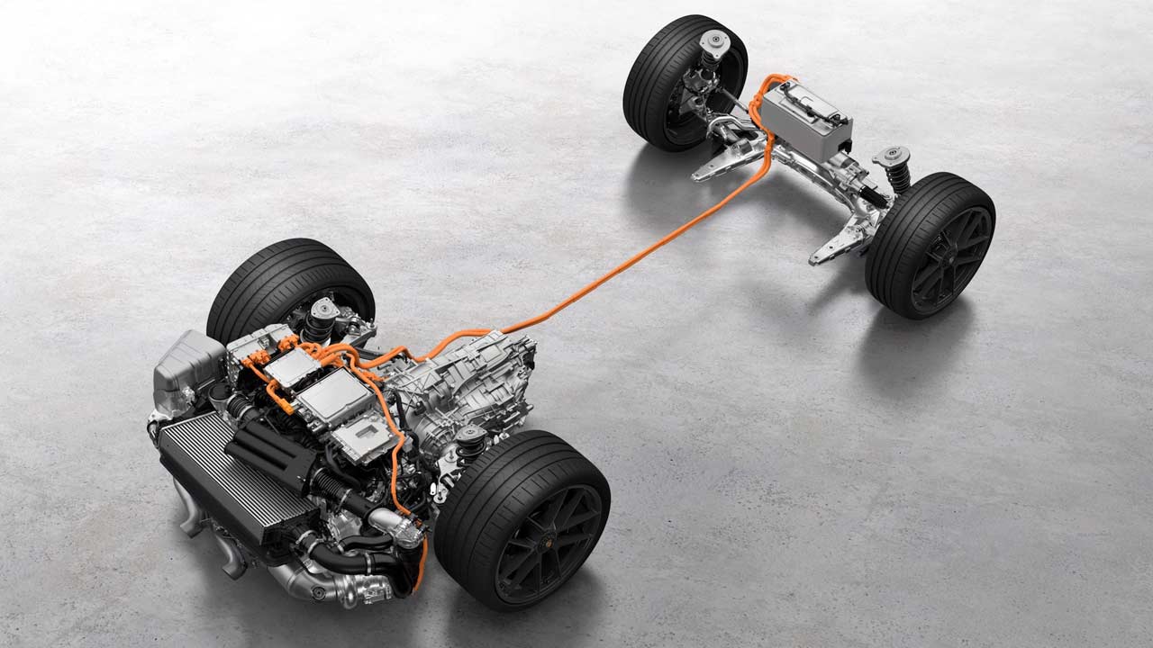 And, the team at Porsche has thought through a lot on how to package the hybrid system with a boxer engine in a compact manner. The air-conditioning compressor is driven electrically, eliminating the belt drive, for example. This creates space above the power unit for the pulse inverter and DC-DC converter.