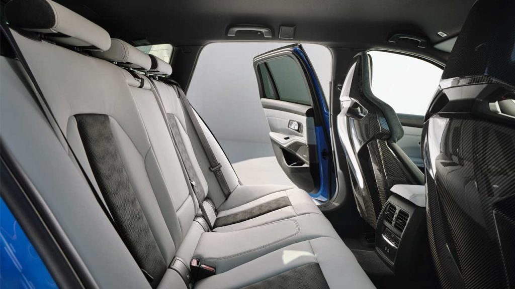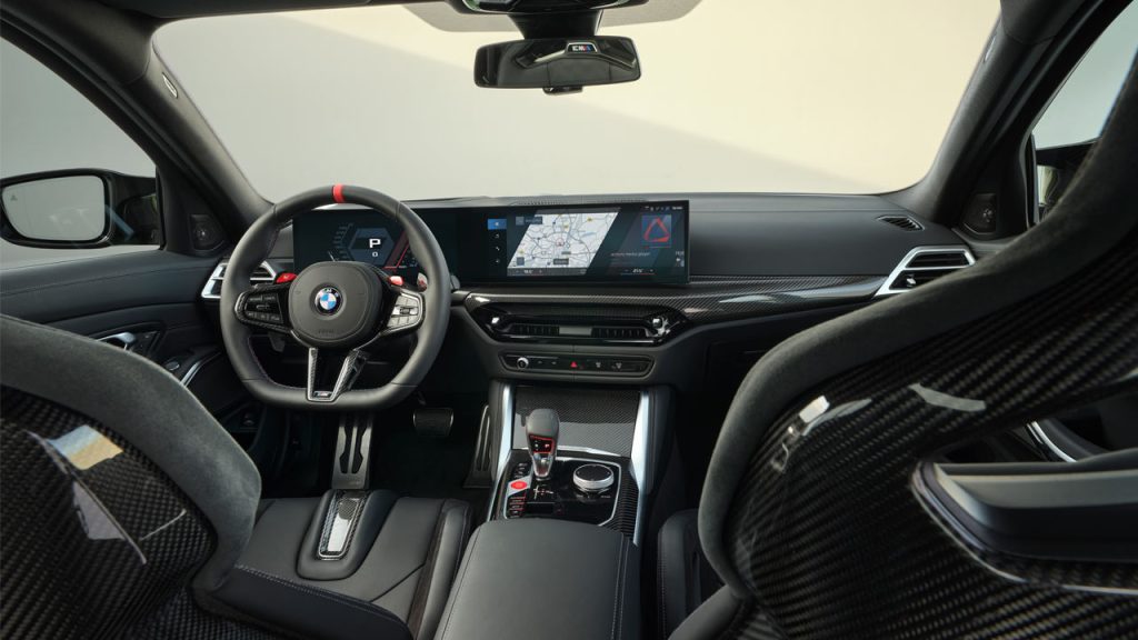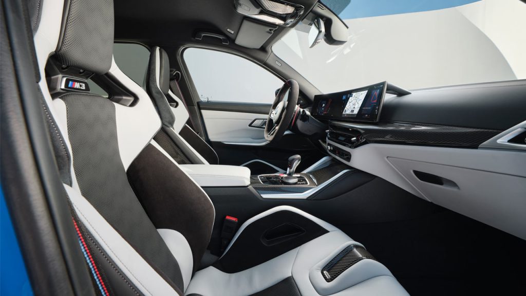 Inside, the new M3 models benefit from the updates/upgrades done to the regular 3 Series models, such as the 8.5 OS version for the displays, a new flat-bottom steering wheel, new central air vents, and new upholstery materials and colors. The photos here showcase the optional electrically adjustable and heated M Carbon bucket seats.