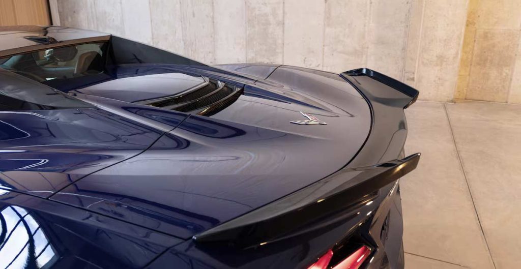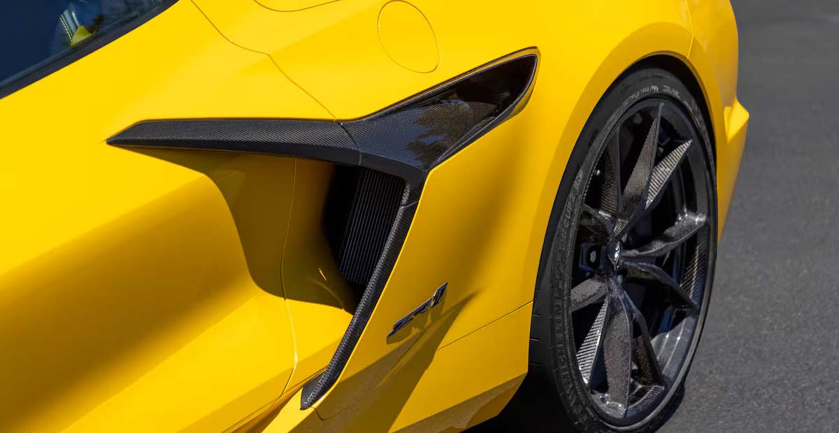The Corvette ZR1 looks almost similar to the Corvette Z06, except for that redesigned hood with a large air outlet. The rear wing, front dive planes, and the hood gurney lip you see here, are all part of the optional ZTK performance package. The package also includes underbody strakes that replace the standard front underwing stall gurney to increase front downforce; stiffer springs, and Michelin Pilot Sport Cup 2 R tires. But don’t worry, it’s not all optional though. The carbon fiber on the side air ducts and the rear hatch is standard. Also standard is the Magnetic Selective Ride Control 4.0. Adjustable front lift with memory is optionally available.