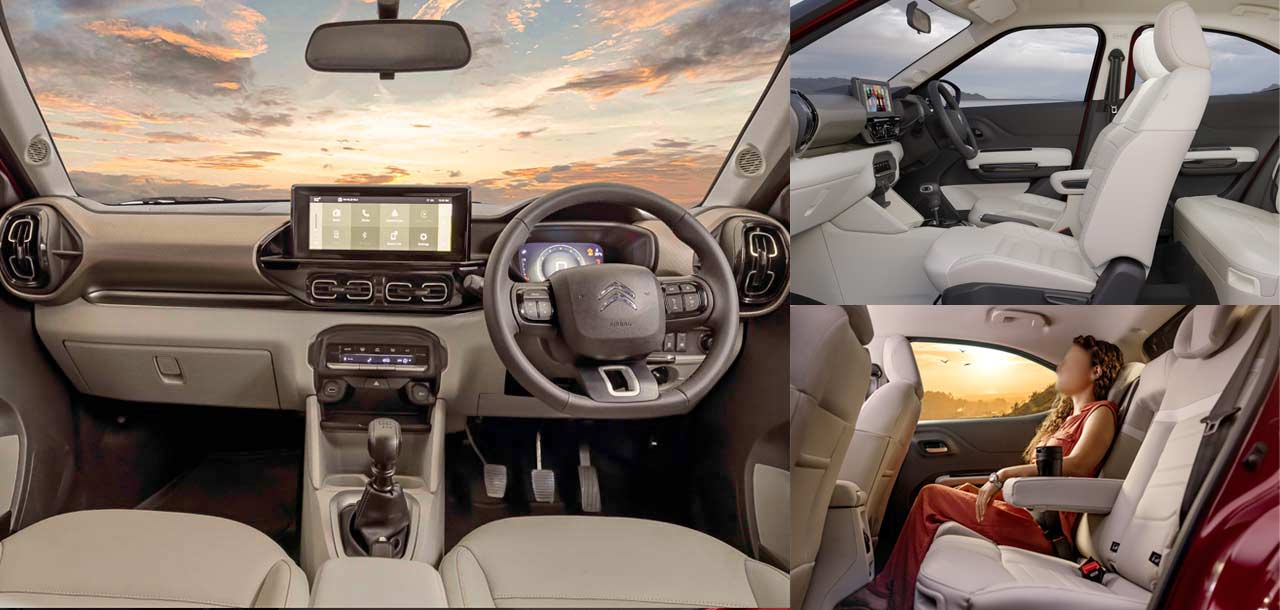 Inside, key highlights include a 10.2-inch central touchscreen, a 7-inch digital cluster, wireless Android Auto & Apple CarPlay connectivity, a 15-watt wireless smartphone charger, My Citroen Connect 2.0 connected car functions, auto AC, and 3-step adjustable rear seating. Safety features include standard 6 airbags, ESP, Hill-hold Assist, TPMS, seat belt reminder for all seats, rear parking sensors, and a reversing camera.